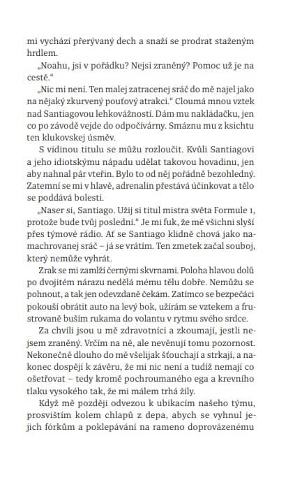 Vedlejší postavy, zejména Santiago, mají v příběhu také své místo. Santi není jen ochranný bratr, ale také jezdec, který si s Noahem nese nevyřešenou minulost. Jejich napjatý vztah dodává ději další vrstvu a ukazuje, že Formule 1 není jen o rychlosti, nýbrž také o egu, loajalitě a soutěživosti.