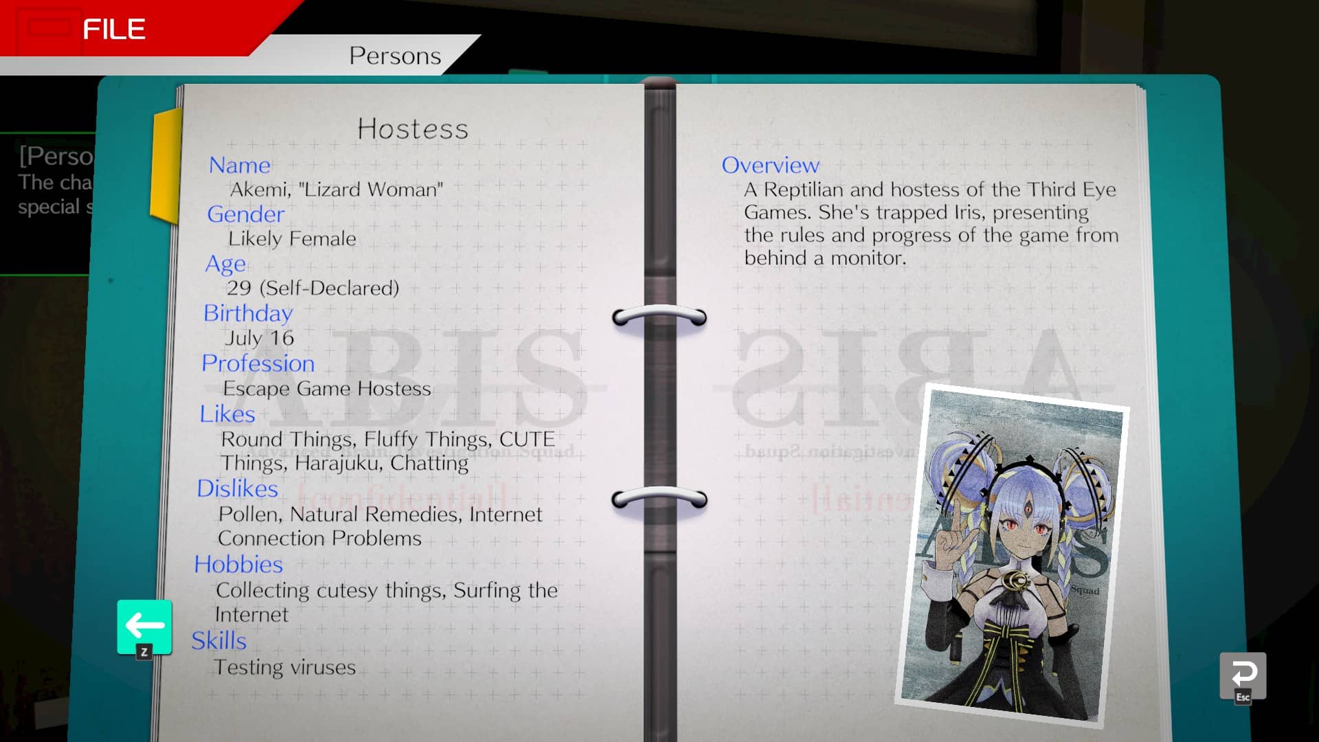 Kromě Datea si zahraje samozřejmě i za Iris Shishido. Ta je internetovým idolem, zvyklá být neustále středem pozornosti. Její bezbrannost v této situaci je kontrastem k její obvyklé sebejisté a energické image, což dává Dateovi silnou motivaci ji zachránit.