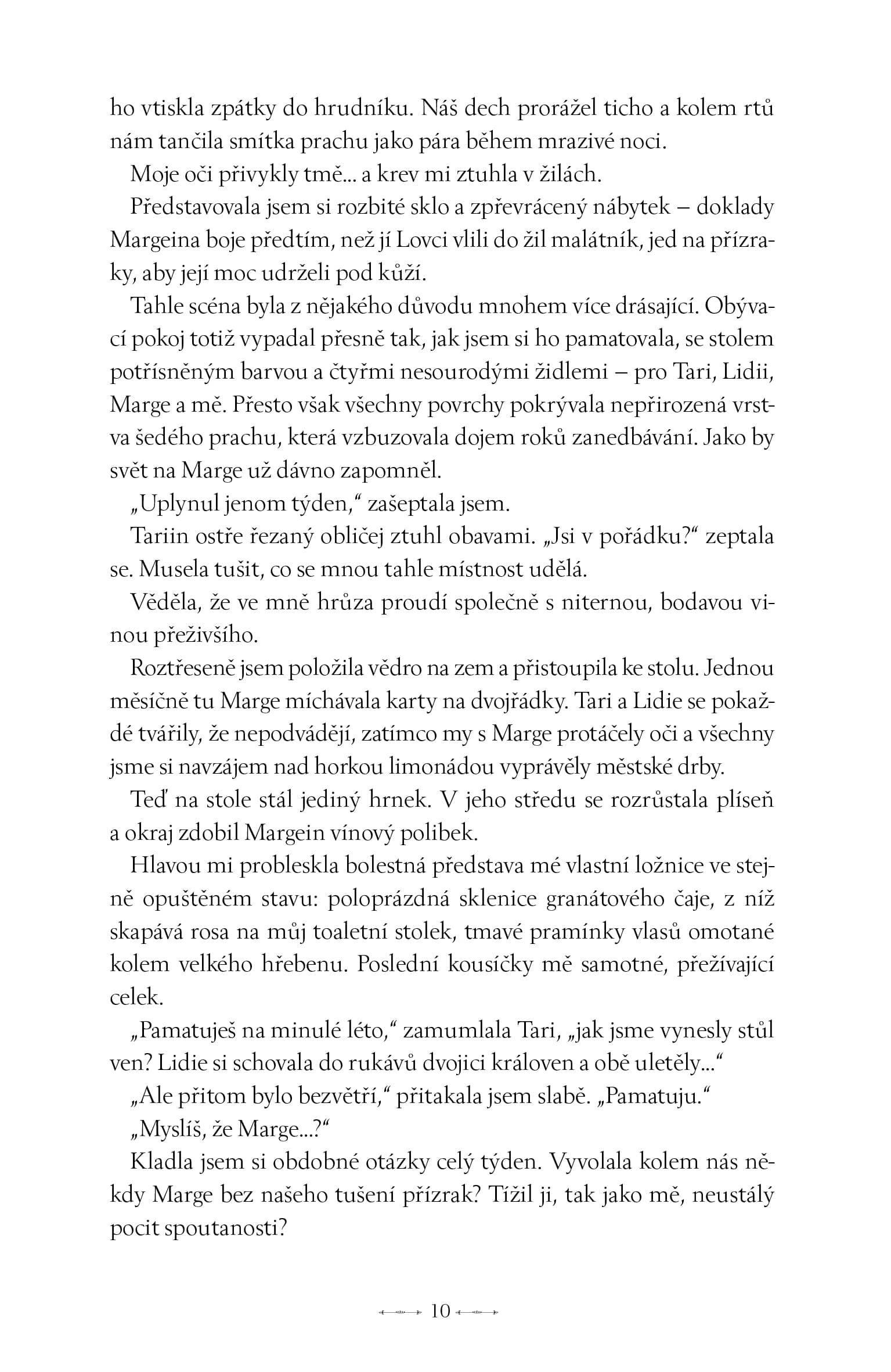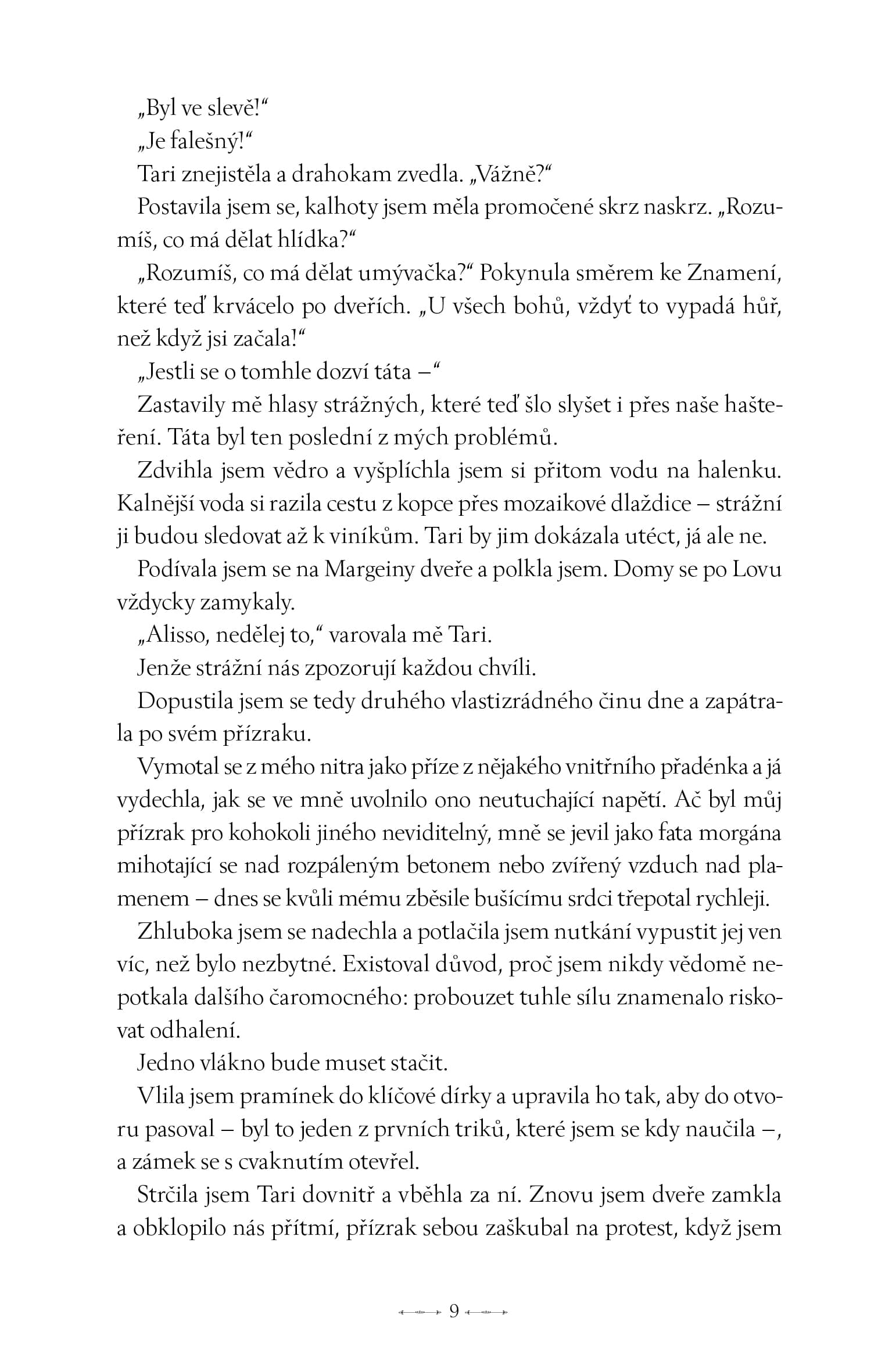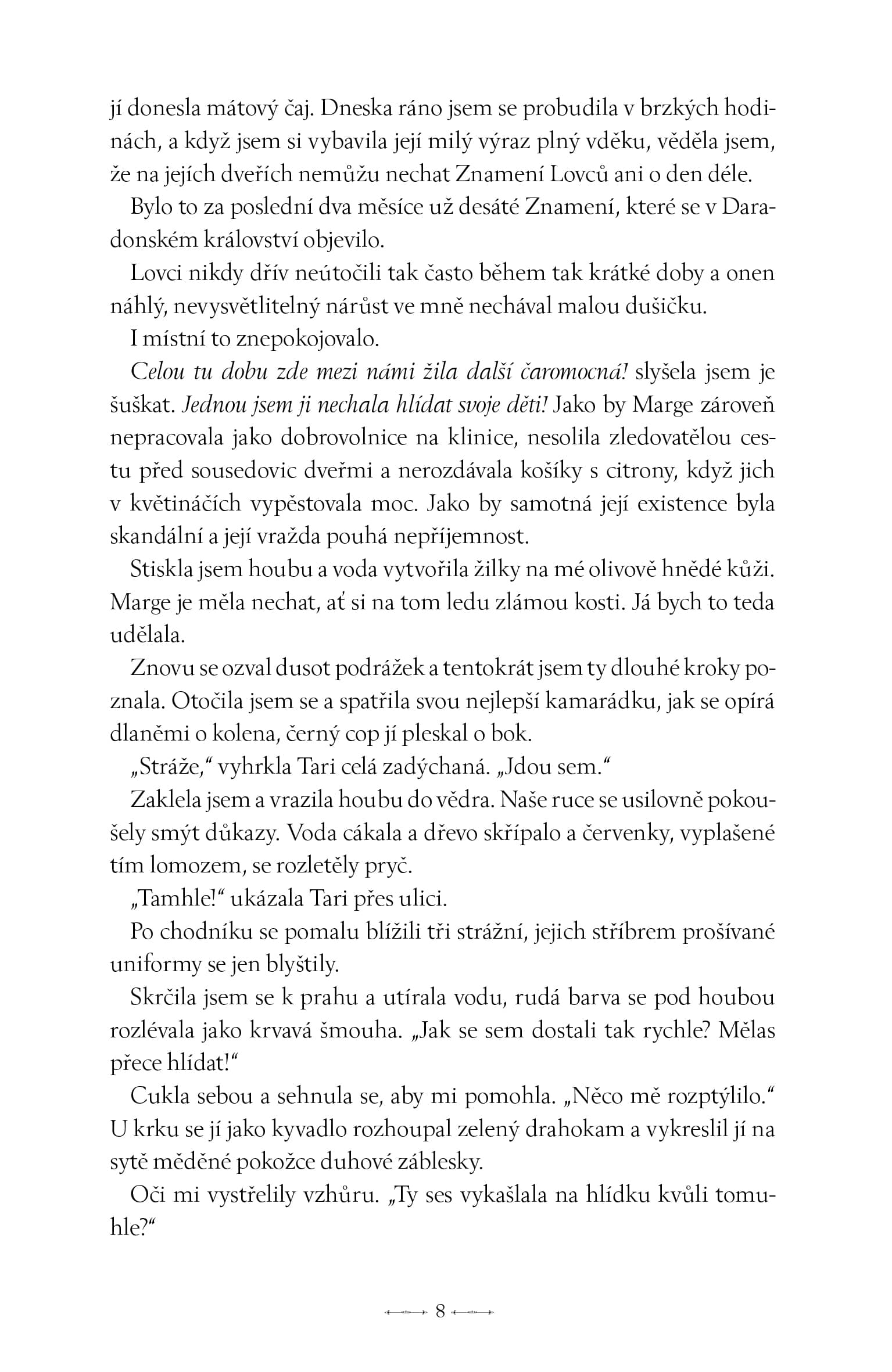 Může se zdát, že se děj rozbíhá pomalu. Opak je ale pravdou. I když se první polovina knihy soustředí především na intriky, vysvětlování situace kolem čaromocných a fungování dvora, pořád se něco děje. Bavilo mě vytvářet si vlastní teorie, sledovat drobné náznaky a přemýšlet, kdo má jaké motivace. Zhruba kolem dvousté stránky však přichází zlom. Děj nabírá na obrátkách, postavy se vybarvují a příběh se mění v napínavé pátrání po viníkovi. To mě bavilo o něco více, ale ani první polovinu bych rozhodně neoznačila za slabou. Spíš jde o pečlivé budování půdy pro všechno, co přijde později.