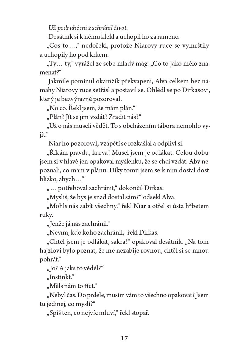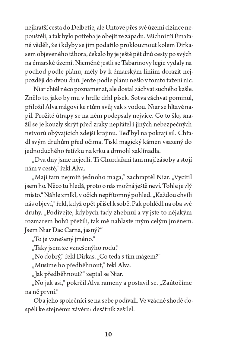 Budování světa je jedním slovem vynikající, obzvláště pokud máte jako já slabost pro historii a antiku. Émarská říše se totiž velmi silně inspiruje starověkým Římem, a to do takové míry, že zde přirozeně najdeme klasické struktury jako senátory, konzuly, nevolníky či disciplinovaně pochodující legie. Mezi oběma hlavními mocnostmi se navíc rozkládají rozlehlé stepi obývané kočovnými Firany a drsnými Skaenany, kteří s velkou radostí rabují a vypalují vše, co jim zrovna přijde do cesty. Toto uspořádání sice působí povědomě, ale díky chytře a střídmě zakomponované magii dostává svět naprosto vlastní, velmi specifickou chuť, která nepůsobí jako laciná kopie. Velice se mi to líbilo a doufám, že dostanu i nějaké volné fantasy pokračování, i kdyby to byl jen nějaký roadbuddy příběh.