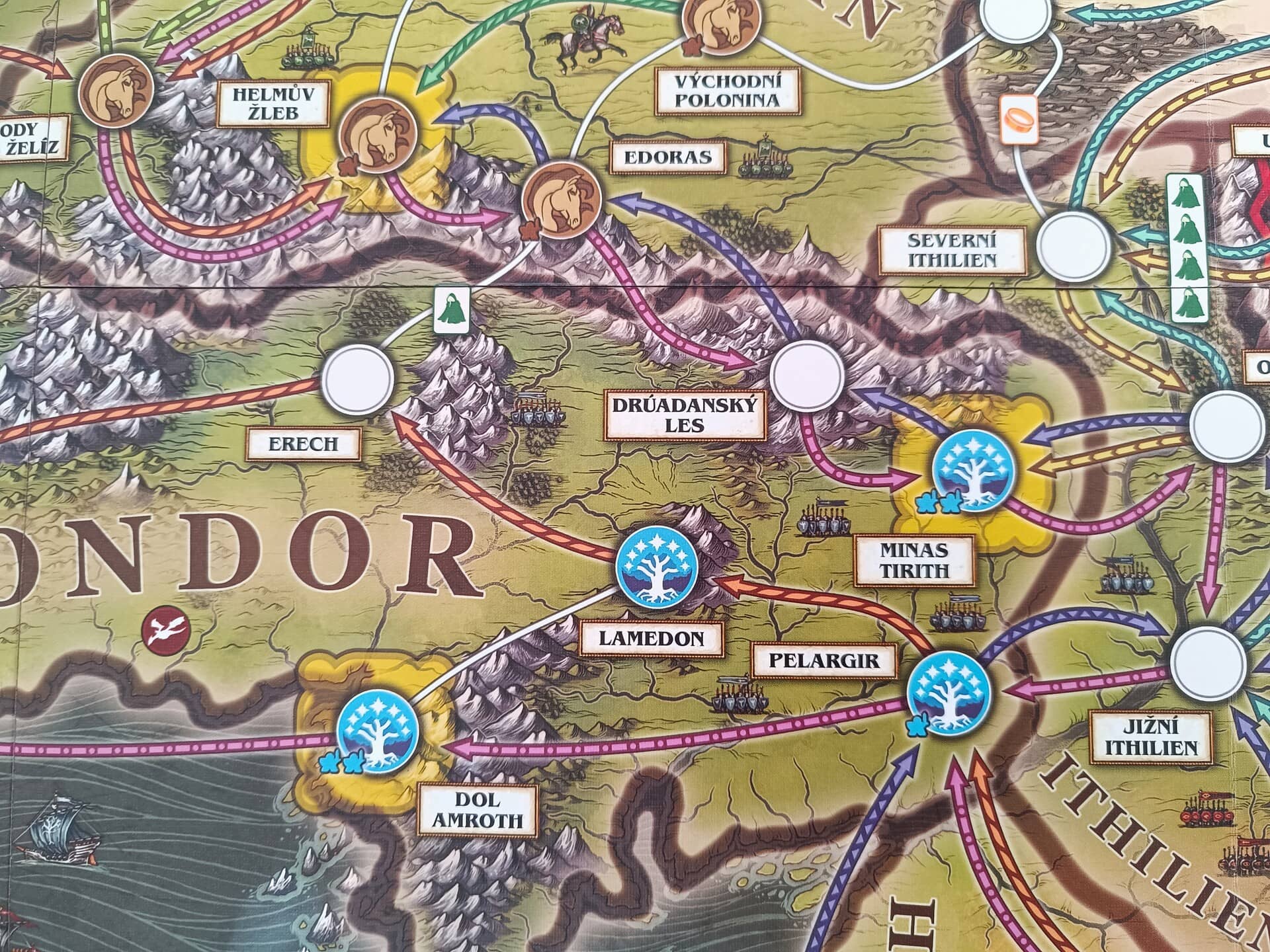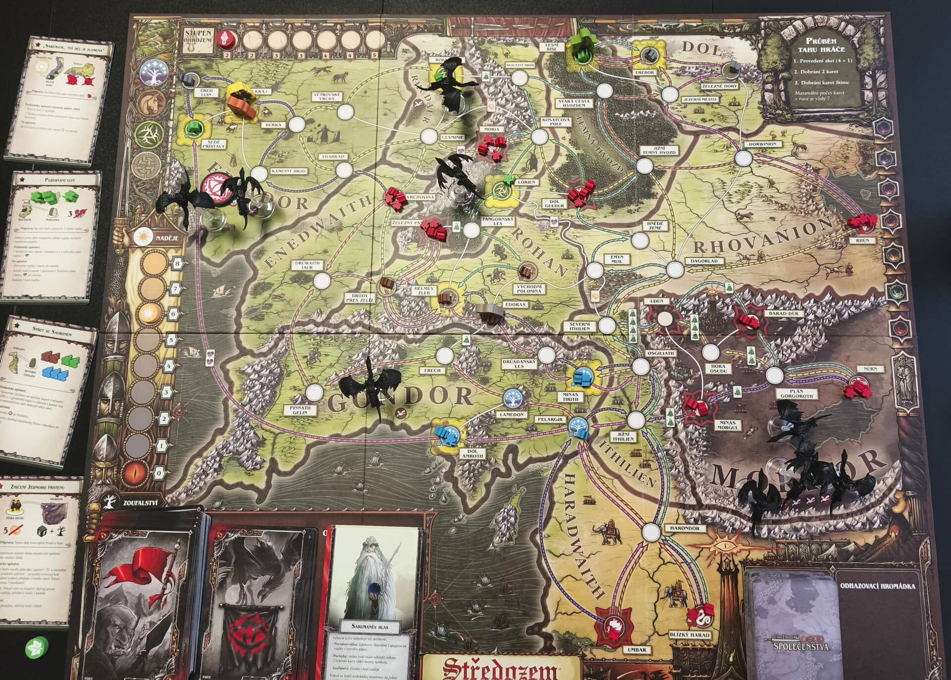 Středobod hry tvoří detailní plán mapy Středozemě rozdělený na regiony tvořené známými lokacemi a vzájemně propojenými cestami. Některé lokace jsou vašimi útočišti, která musíte před nepřáteli chránit, a naopak jiné slouží jako temné pevnosti, ve kterých se objevují noví útočníci a které můžete dobýt. Kromě plánu v krabici najdete dřevěné figurky hlavních postav a vojáků, plastové figurky Nazgûlů, dřevěné a kartonové žetony, kostky a 74 různých karet.