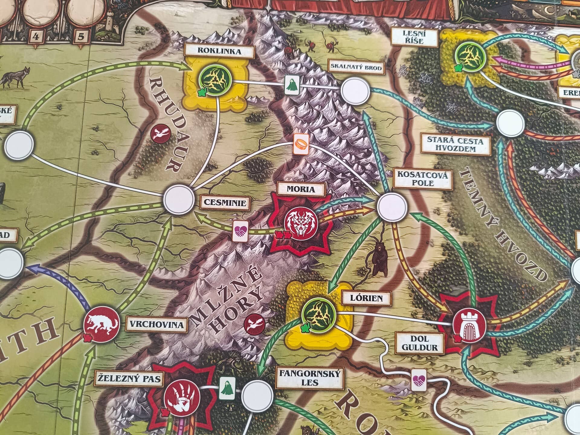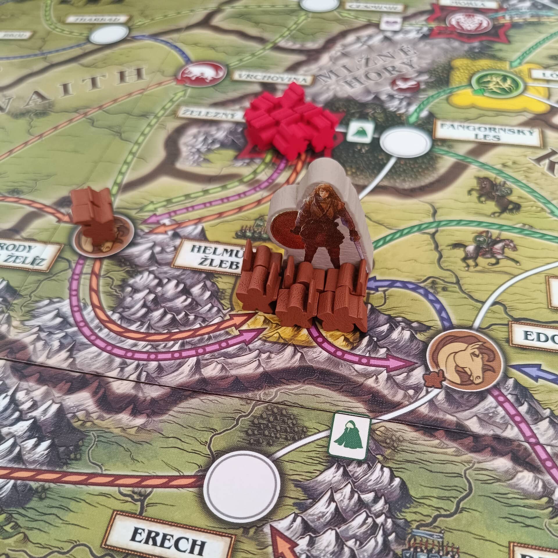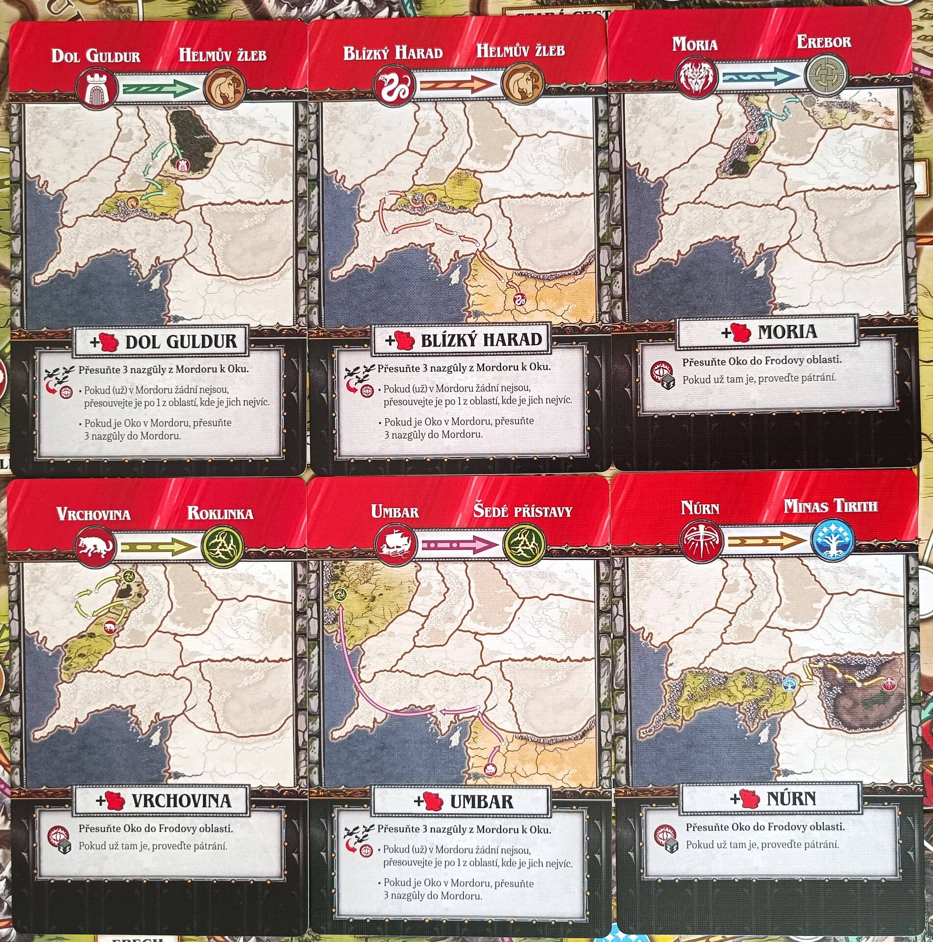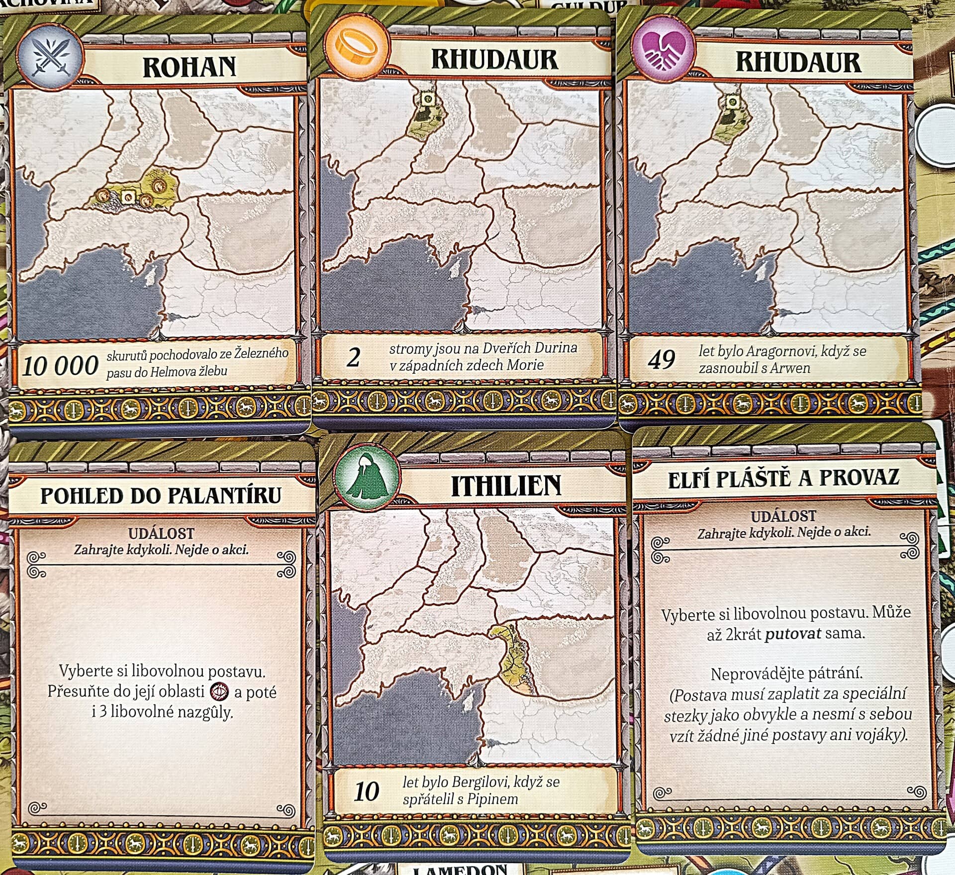 Karty vám mohou přihrát nějakou pozitivní událost, anebo společně s žetony představují různé symboly, které pak fungují jako platidlo za provádění dalších akcí. Například v některých lokacích můžete za symbol přátelství verbovat nové vojáky, za udatnost můžete dobývat nepřátelské pevnosti, s nenápadností se můžete přesouvat po speciálních cestách a vzdor využijete pro přehazování kostek při pátrání a bojích.
