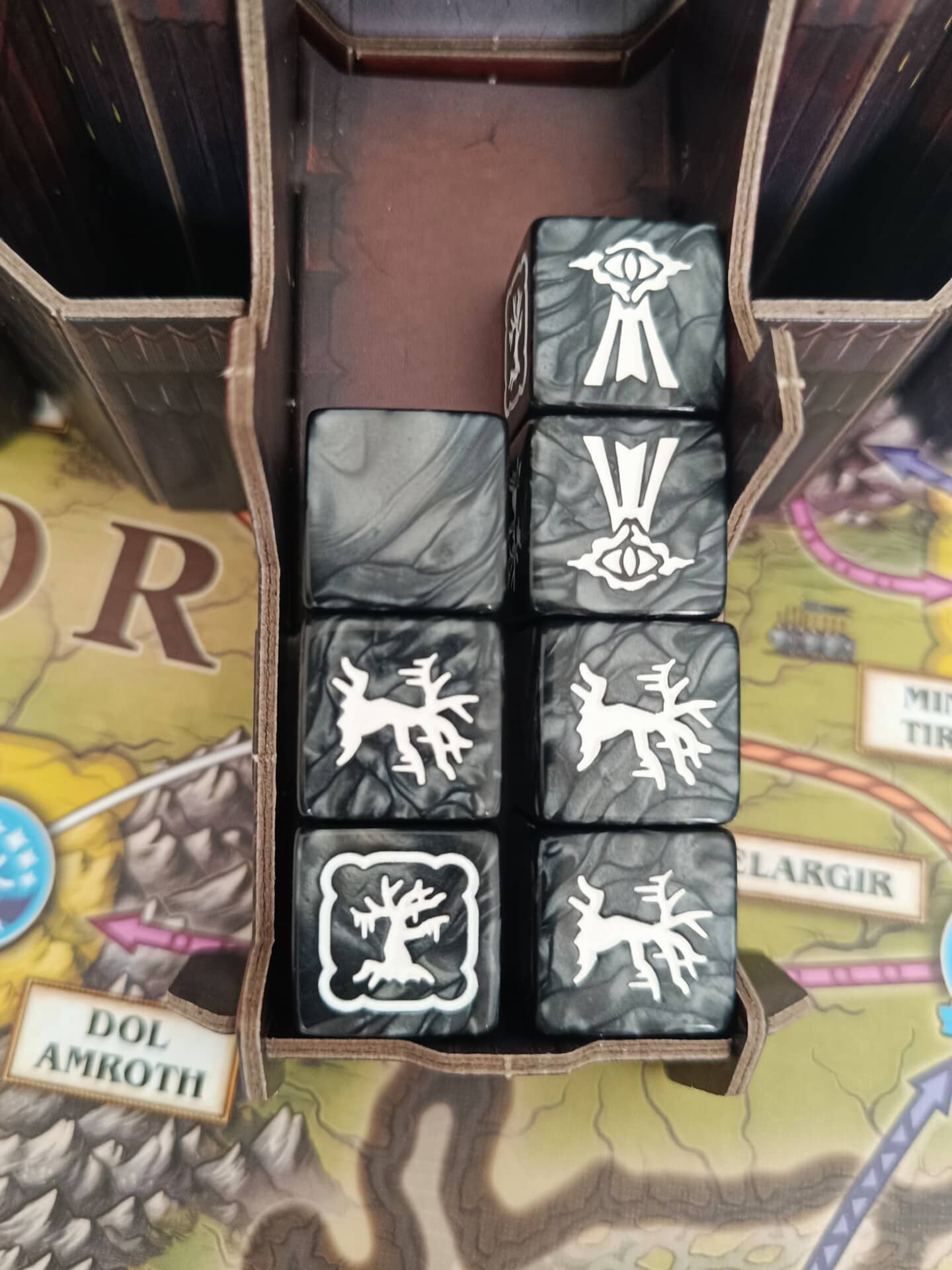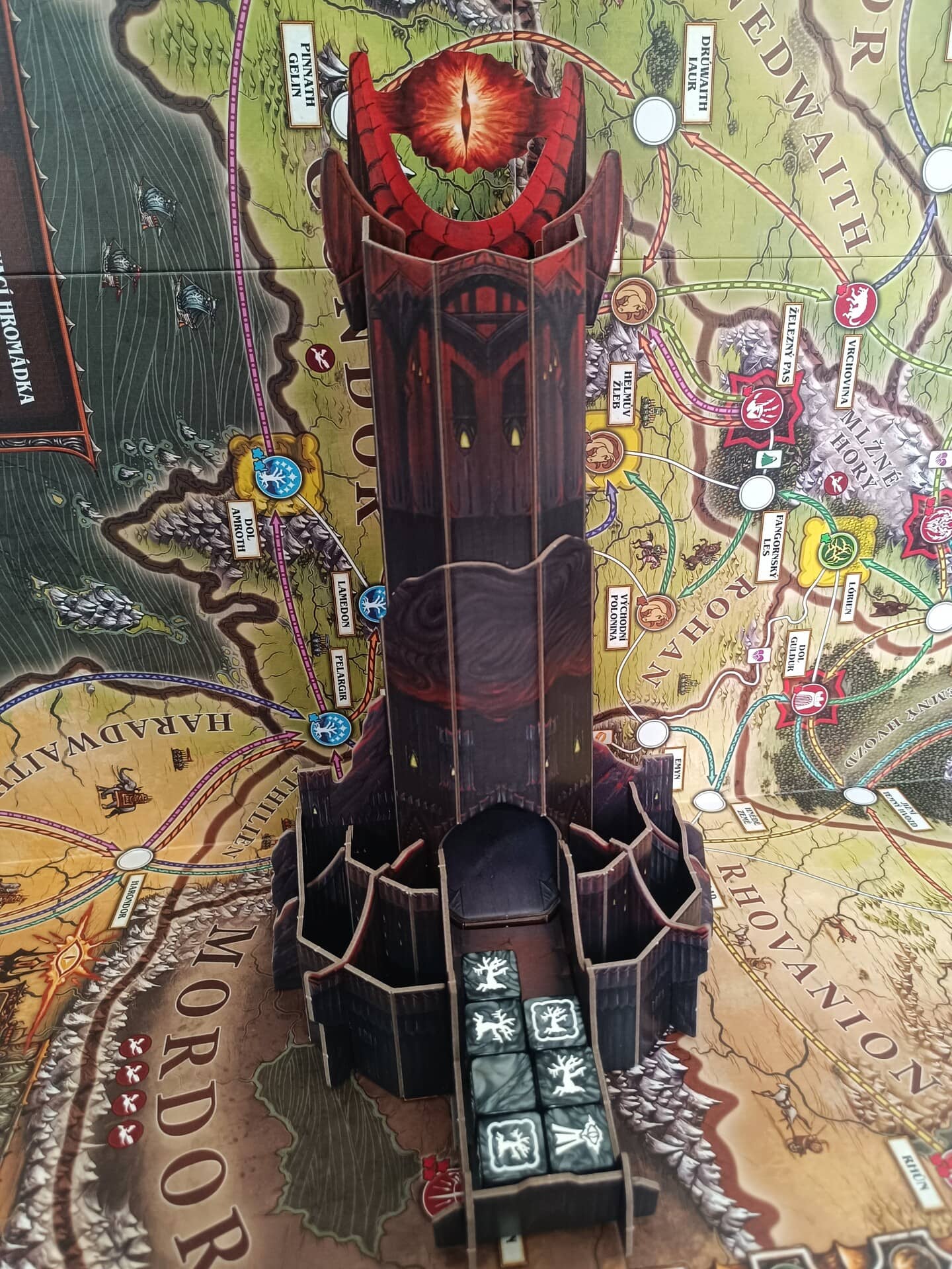 Atmosféru silně podtrhuje velká kartonová Temná věž se Sauronovým okem, kterou si hráči složí podle návodu a která následně slouží jako kostková věž. Osobně se mi líbí, protože posiluje téma a vizuální stránku hry. Pro někoho to ovšem může být prvek, bez kterého by se obešel a spíše by ocenil menší balení a nižší cenu. Krabice ještě obsahuje základní insert, který počítá i s obalenými kartami.