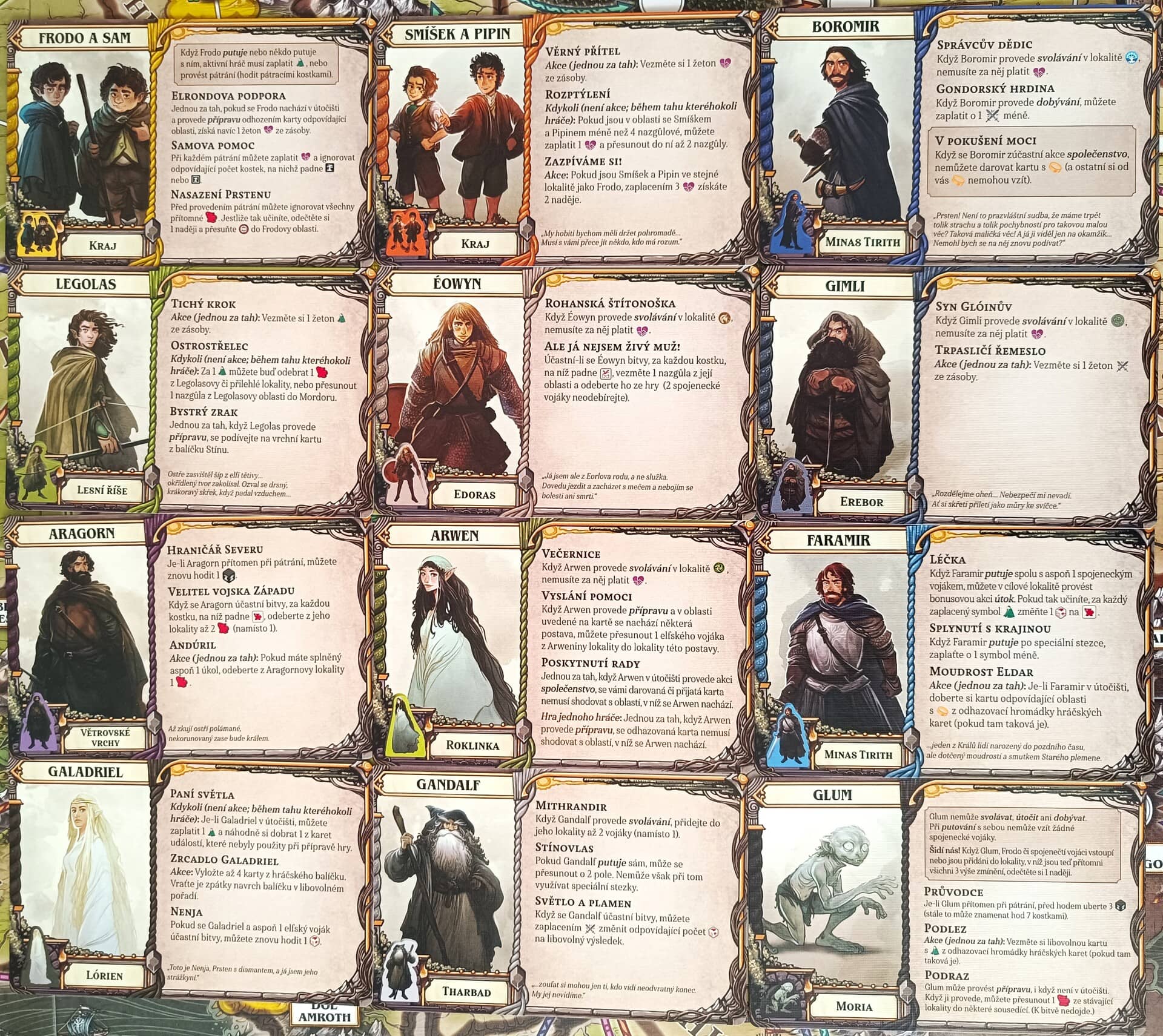 Pán prstenů: Osud společenstva je doslova prošpikován odkazy na knižní i filmovou předlohu. Každá karta obsahuje citaci části příběhu. Frodo a Sam, stejně jako Smíšek a Pipin, tvoří v páru jednu postavu reflektující jejich akce a schopnosti. Některé akce můžete vykonávat jen ve specifických lokalitách a s konkrétními spojenci, což odráží příběh a prohlubuje plánování. Zároveň každá z misí představuje konkrétní událost ze světa Středozemě, stejně tak i karty událostí.