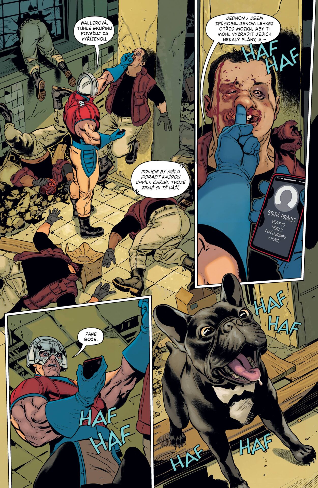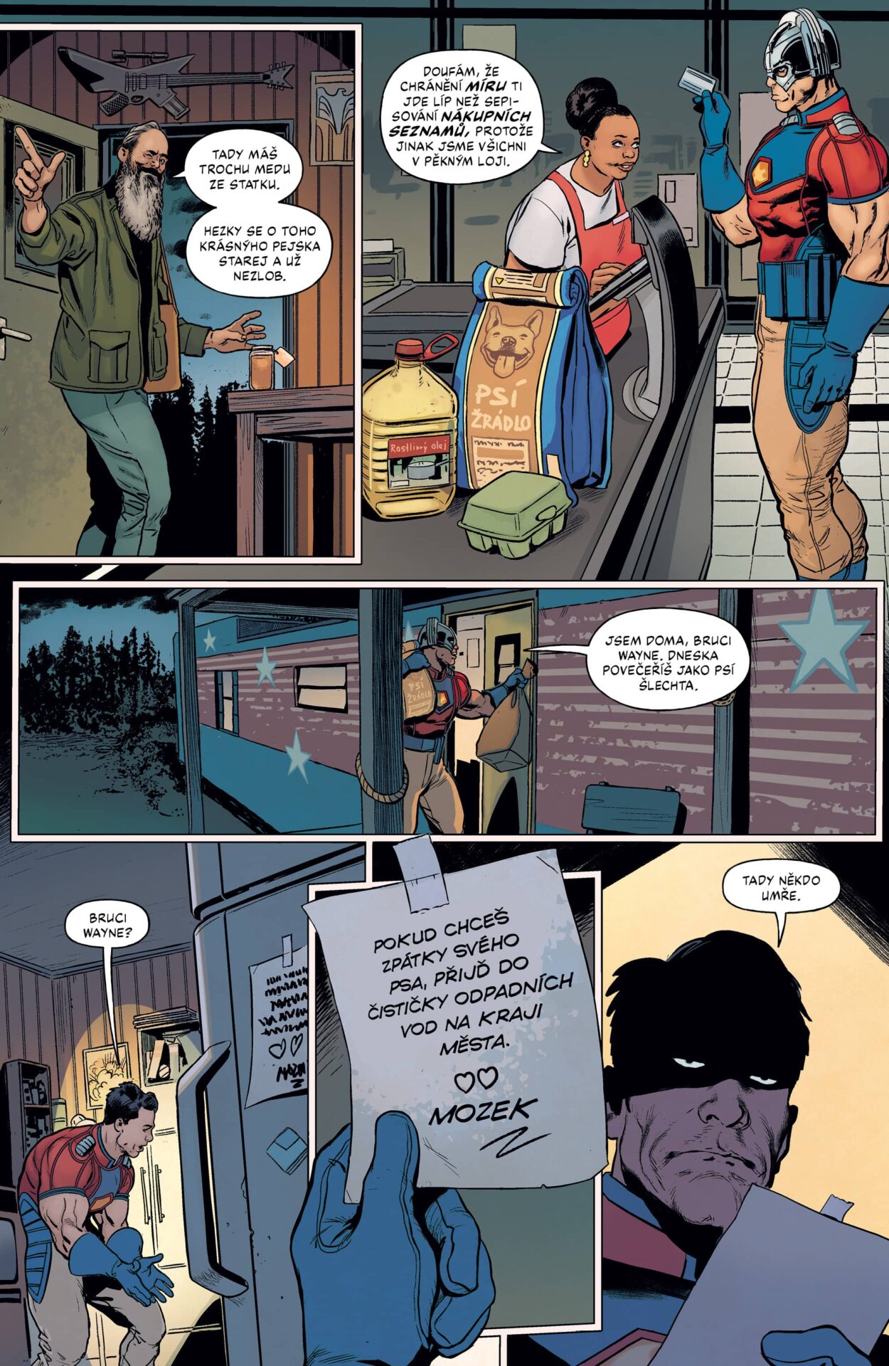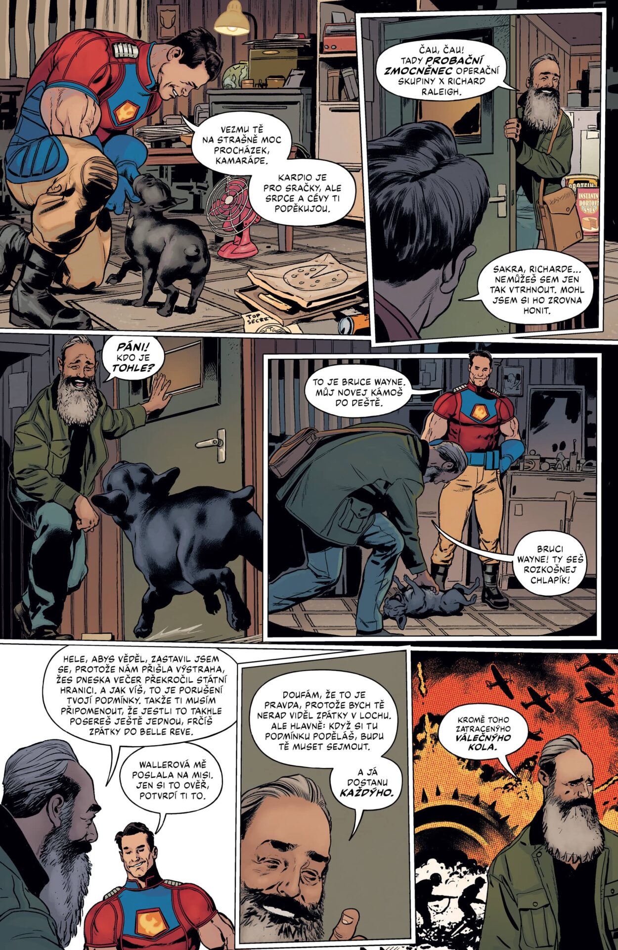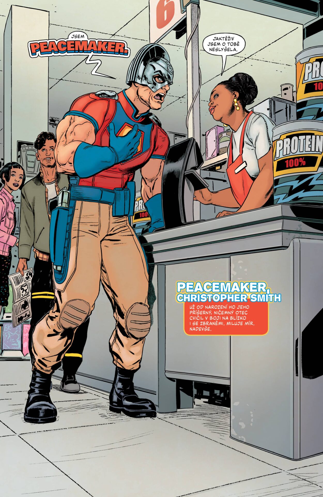 Děj komiksu je postaven na jednoduché, ale nesmírně efektivní a emocionálně rezonující premise, která si bere to nejlepší z akčních filmů. Christopher Smith alias Peacemaker je po propuštění ze Sebevražedného oddílu opět na volné noze a snaží se konat dobro, ačkoliv si o něm všichni, včetně ostatních padouchů, myslí, že je jouda. Včetně King Sharka. Té velké ryby, co žere lidi. KING SHARKA! Každopádně Peacemakerův osamělý a poněkud patetický život nabere nový smysl ve chvíli, kdy při jedné akci narazí na nejrozkošnějšího a nejnemotornějšího psa na světě, kterého pojmenuje Bruce Wayne.