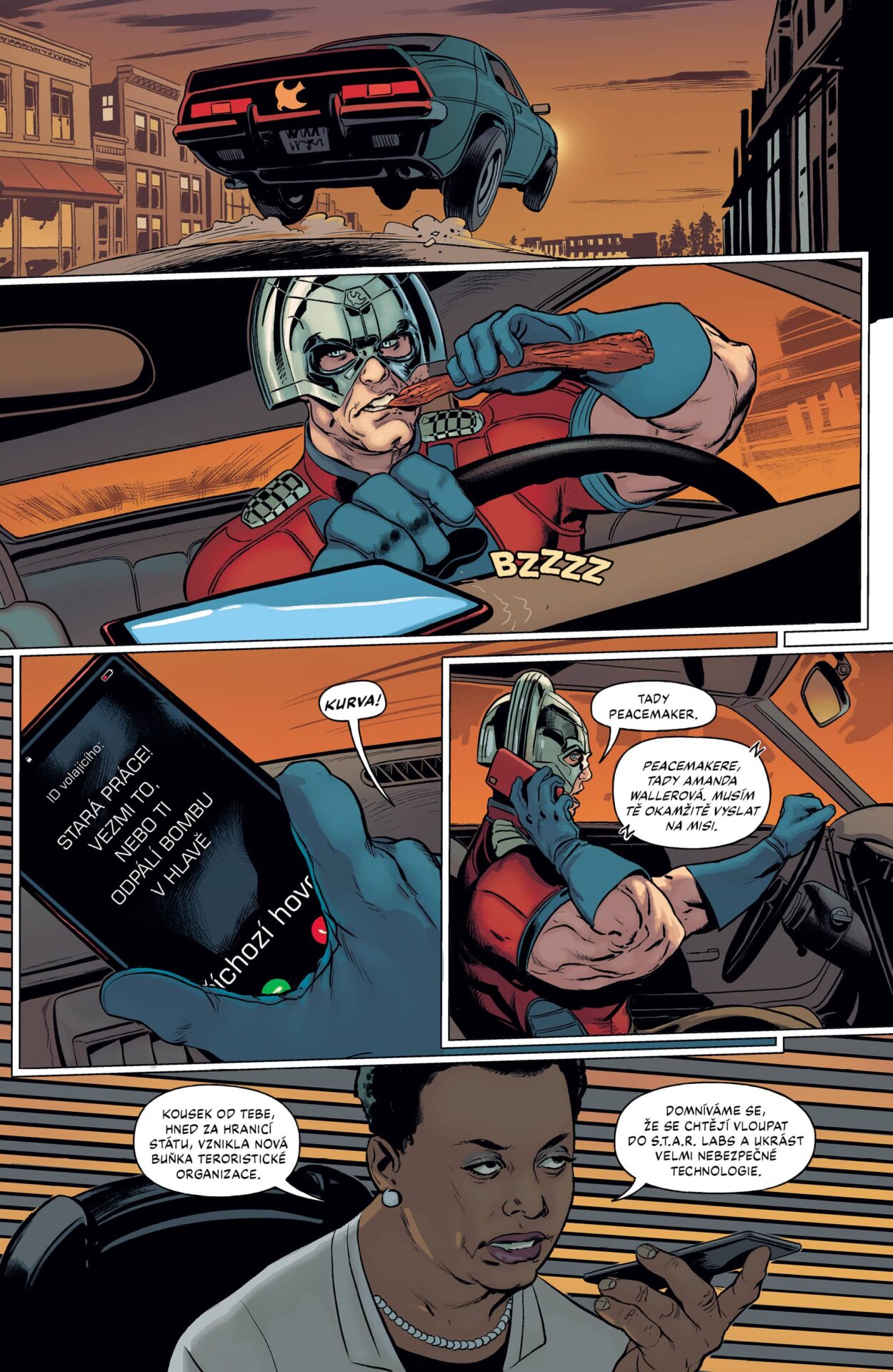 Kdy se v jeden moment tento antihrdina zhroutil a dovolím si citovat: “ Cítím se kvůli tomu hrozně. Nejenom, že jsem přišel o svýho kámoše, ale pozornost mi očividně schází natolik, že jsem byl nadšenej z toho, že mě potřebuje párek frajerů, který jsou schopný ukrást psa. Navíc se ukázalo, že by tu práci klidně zvládli beze mě, a pak mě zradili a pokusili se mě zabít… Takže nejsem v pohodě. Moje existence je momentálně protkaná příšernou osamělostí a všeobklopující neschopností. Jsem nikým nemilovanej, bezcennej lúzr, kterýho v životě nikdo nepotřebuje.” Musím říct, že tohle byl moment, kdy jsem se do díla Peacemaker se fakt snaží! vážně ponořil, a ne že bych ho chápal, ale rozhodně vím, jak se ta postava cítí, a to byl zlom.
