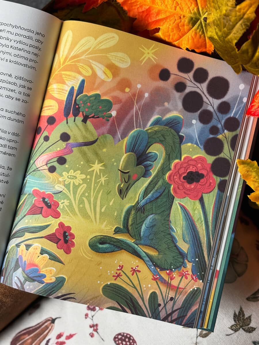 Obálku zdobí ilustrace z pohádky O kouzlu dračích slz. Ta zobrazuje dívku tulící se k dráčkovi, což v mém drakumilném dítěti ihned vyvolalo velkou touhu si knihu přečíst. Bohužel jde ale trochu o klamavou reklamu. Ačkoliv na obálce je drak velmi prominentní, samotné příběhy draky téměř neobsahují. Pořádně je vlastně jen právě v O kouzlu dračích slz. Kromě té se drak mihne ještě v příběhu Dračí korále. A to je vlastně vše. Pokud se tak vaše děti těší na příběhy plné přátelských okřídlených ještěrek à la Jak vycvičit draka, z Pohádek před spaním budou pravděpodobně lehce zklamané.