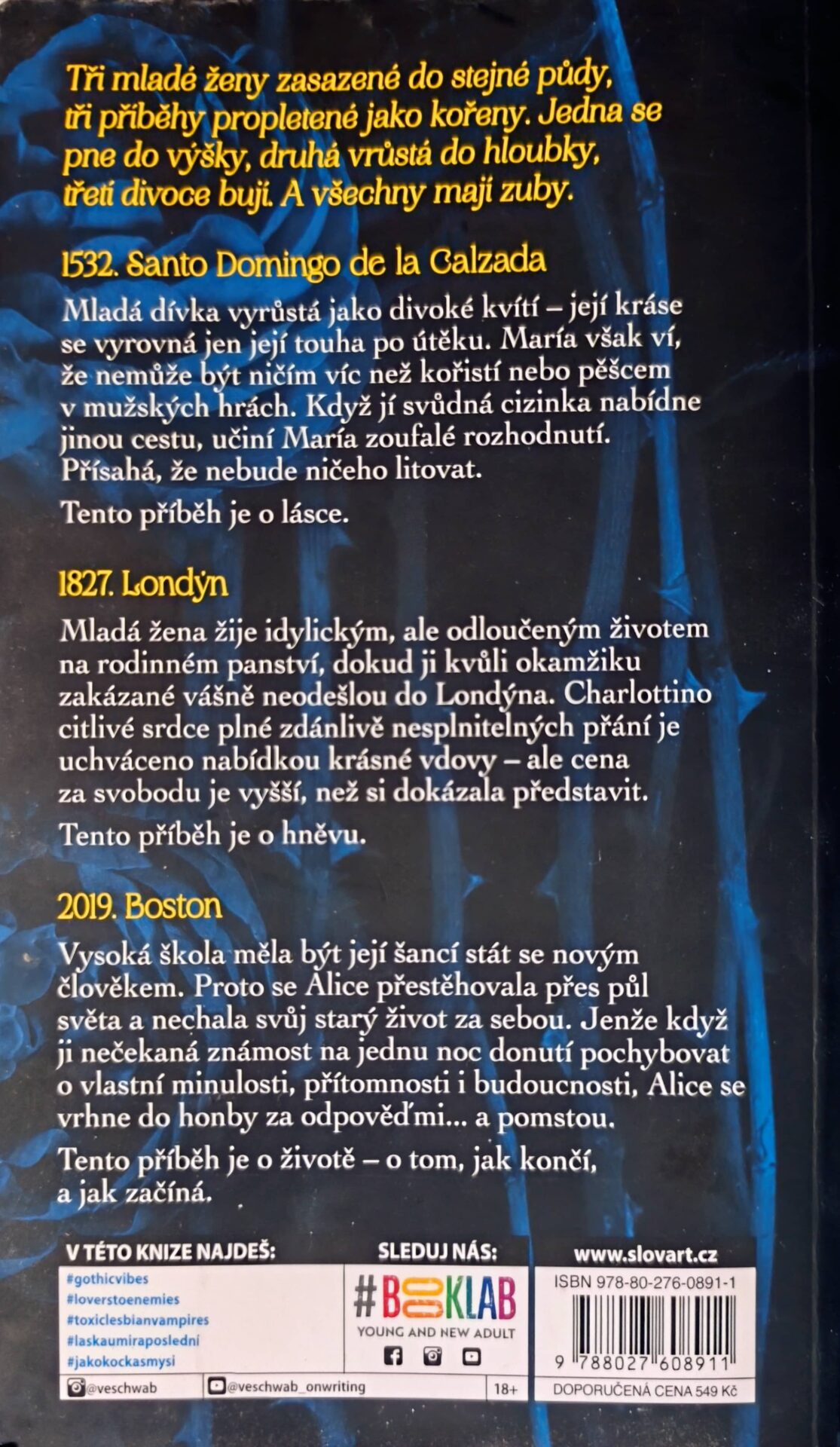 V. E. Schwabová zde rozehrává temný, melancholický příběh, který se pomalu vine napříč staletími a postupně odhaluje, že některé osudy jsou propojené silněji, než by se na první pohled zdálo. Nejde o knihu, která by se snažila čtenáře ohromit efektními zvraty nebo rychlým tempem. Je to vyprávění, které se zakusuje postupně, tiše, vytrvale a s nečekanou intenzitou, a které staví především na atmosféře, emocích a hlubokých vnitřních proměnách svých hrdinek.