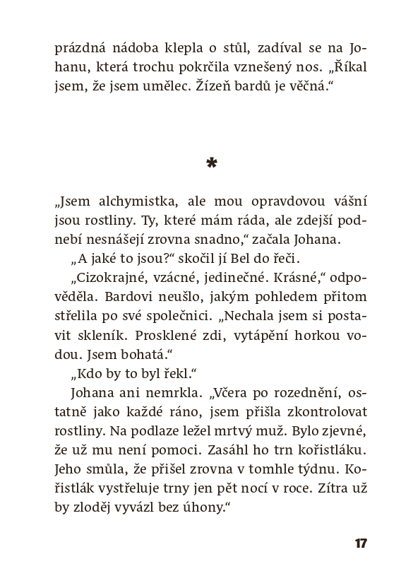 Autorka totiž od prvního dílu udělala očividně velký krok kupředu. Nehraje se tu na náhodu, ale Ef s Belem vážně odvádí detektivní práci. Hledají stopy, mluví se všemi podezřelými a odhalují zápletku, která není tak jednoznačná, jak by se mohlo zdát. Ostatně, vždycky je nejsnazší hodit vše na zahradníka. Tady jde ale o výslechy a pozorování detailů. Jste součástí skutečné detektivky, ne jen fantasy, kde se umělec-učitel (ha švadlena-kytaristka) a bylinkář oddávají nějaké vedlejší činnosti. Tohle je zamotaný případ a autorka vás nenápadně vede k epickému finiši, kde si budete klepat na čelo, jak to že jste to s klukama neviděli. Musím říct, že ten proces je příjemný, viditelný a hmatatelný.