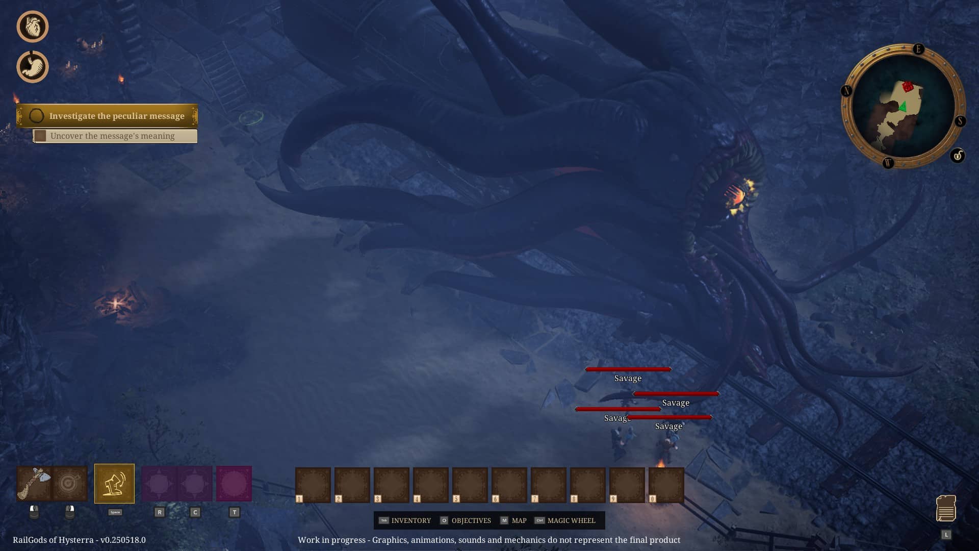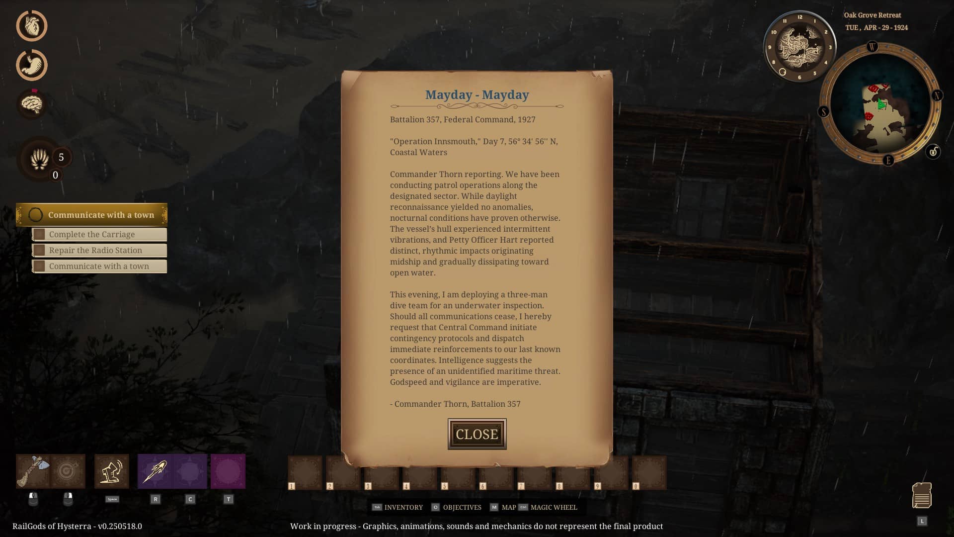 Ujmete se zde role Snícího (The Dreamer), člověka, který se probudil z říše snů a je nyní spojen s nejpodivnější entitou v Hysteře – RailGodem. Tím, že jste Snící, jste sice jedni z mála, kdo může vůbec v takovém světě fungovat, ale zároveň jste neustále ohroženi Šílenstvím (Insanity).Příběh je prozatím v rané fázi a slouží spíše jako atmosférické pozadí pro mechaniky, ale jeho lovecraftovská premisa je naprosto pohlcující. Cestujete mezi posledními bezpečnými zónami, sháníte zásoby a objevujete temné příběhy přeživších, abyste pochopili, jak se postavit entitám, které překračují vaše chápání. Klíčovým prvkem narativu je právě symbiotické pouto s RailGodem. Cesta k přežití vyžaduje, abyste konali temné skutky a přijímali „temné dary“, které vás vzdalují od lidskosti, ale přibližují k síle boha.