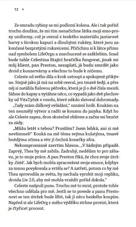 Kromě umělého předělu světa na Metropoli a Vnější země a sociální hierarchie se potkáte i se slibným konceptem modifikací. Lidé se pro větší produktivitu nechávají operovat, doplňovat se robotickými součástkami, přičemž se zaměřují na konkrétní oblast. Říká se jim proxies. Všechny si je vyjmenovávat nemusíme, ale například sprinter-proxy jsou lidé plnící úkoly pro kurýry, často s modifikacemi v podobě motorů a trysek v nohách a tak podobně. Nebo třeba rela-proxies, kteří se zaměřují na „udržování vztahů“ za své klienty. Je to docela extrém, protože v popisu jejich práce je například rande s rela-proxy klientovy manželky místo toho, aby se manželé setkali spolu… Ale ano, to je přesně to, co od sci-fi a dystopie čekám. Vyhrocenost a extrémnost pravděpodobného. Co je horší, že tento koncept v pozdější fázi knihy už skoro nehraje roli.