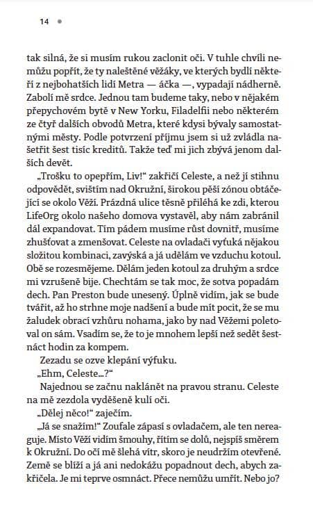 Když se Adrian dostane do té „divočiny“ za Metropolí, navíc i s Liv, vůbec to často působí, že ti dva mají více štěstí než rozumu. Takový silný „plot armor“, řekla bych. A protože divočina zabírá takovou část knihy, nedává to smysl. Nač vytvořit vlastní svět, město s vlastními zákony a pravidly, a pak dvě hlavní postavy nechat rozvíjet vztah uprostřed lesů, kytiček a zvířátek? To tu už párkrát bylo…