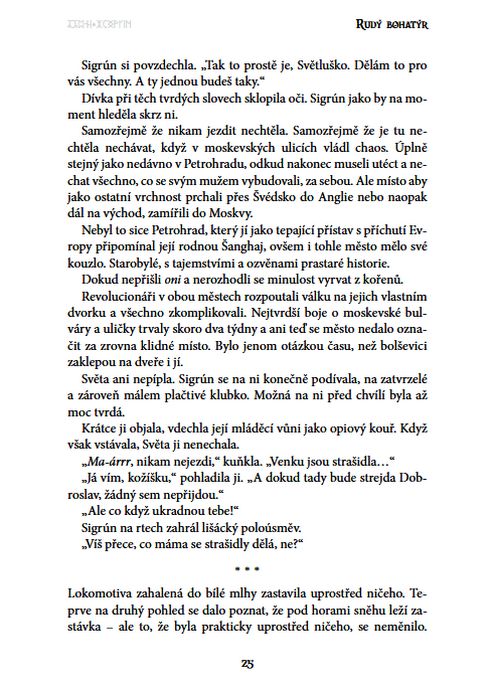 Ačkoli se ze stránek prvních kapitol každým okamžikem vynoří nějaká nová postava, čtenář z toho nemá v hlavě maďarský guláš a nemusí si provázkem spojovat poznámky na korkové tabuli, aby si všechna jména správně zařadil. Když se mi Rudý bohatýr poprvé dostal do rukou, zalétly mi myšlenky k Dostojevskému. Několik odstavců poté, co se ve Zločinu a trestu na scéně objevil jakýsi Ivan Petrovič, se jali představovat Petr Ivanovič, jeho bratr Váňa Ivanovič a jejich soused Anton Petrovič Ivanov. Parafrázuji, jistě; pokouším se jen poukázat na to, jak snadné může být se ztratit ve stránkách knihy, které rozhodně nechybí postavy, ale zato jí chybí rejstřík. Rudý bohatýr ve mně navzdory své délce nikdy nevyvolal zmatek, což je hodné potlesku. I vedlejším postavám se dostalo tolik osobitosti, aby se člověku udržely v hlavě, a k jejich představování dochází hezky postupně.