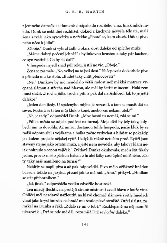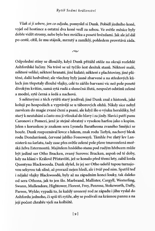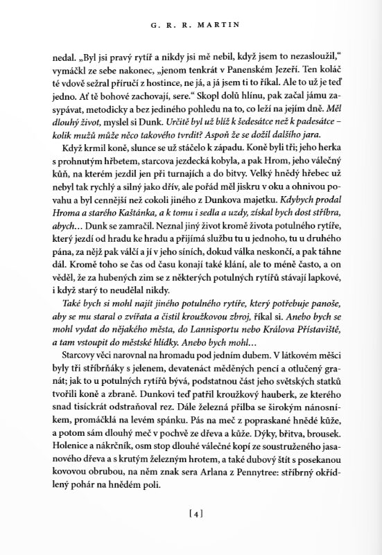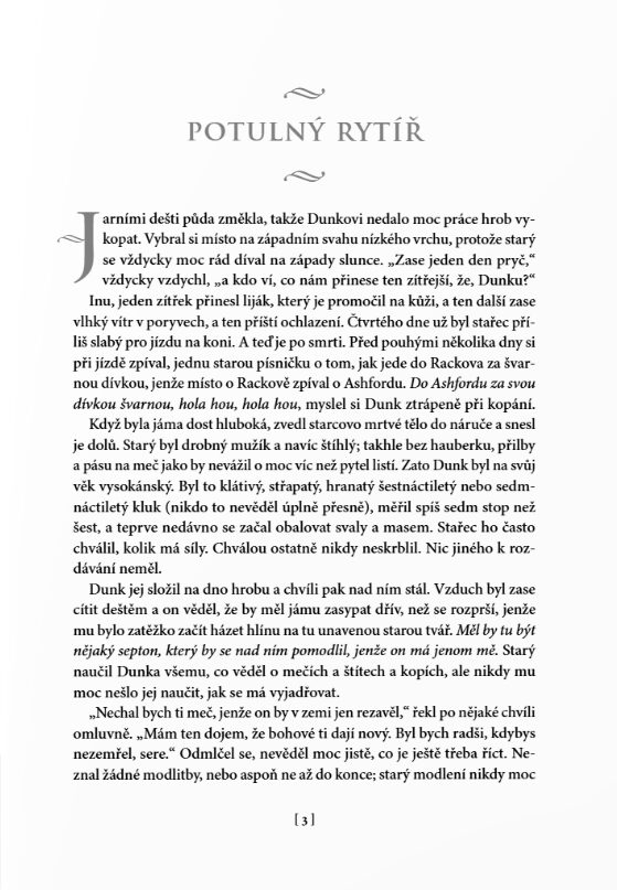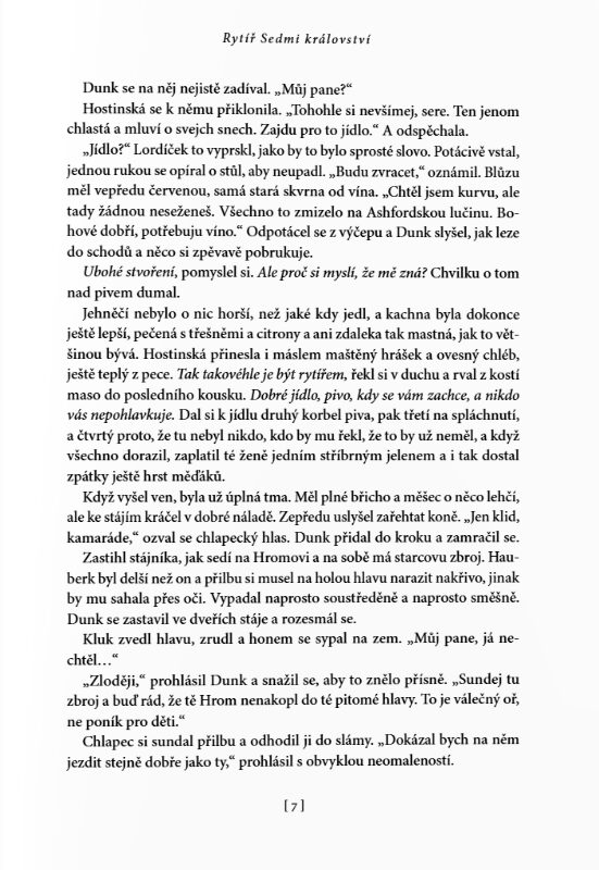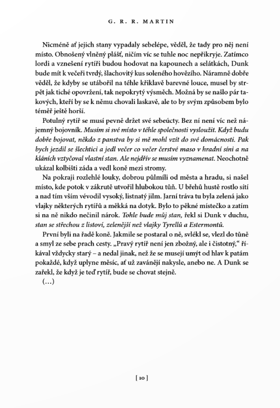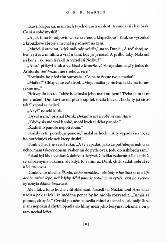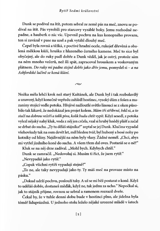 Největší předností povídek je jejich začátek a konec. Martin bere to maximum, co prodává v sáze, a zhutní to na pár stran na doslova mikropříběhy jedné dvojice. Je to parádní, malé, funkční a přitom hrozně prosté. Je to jako číst krásnou, nesložitou středověkou fantasy, možná i bez toho fantasy, protože to je příběh spíš o středověkém rytířství. O loajalitě, o cti, o přátelství. O vztahu rytíře a jeho panoše. O dospívání, o přátelství. Víte, jak se neustále omílají ty romantické ctnosti nezaprodaných rytířů? To je, prosím, Dunk. A pro změnu o rozmazlených princích a zbohatlické šlechtě? To jsou pro změnu všichni ti ostatní a tady je právě to nejdůležitější udržet svoji ctnost.