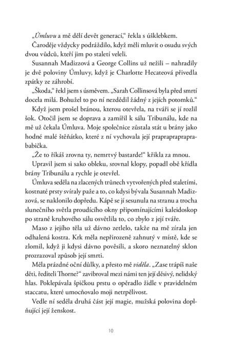 Autorka na nic nečeká a rovnou šlape na plyn. Už po pár stránkách přichází slušné tempo a první setkání Willow a Graye má fakt grády. Willow si vás nejspíš hned získá – je ostrá, sebevědomá a své přírodní magii rozumí a umí ji náležitě využívat. A i když její největší tajemství – to, že žije – praskne hned na začátku, většinu si nechává pro sebe. Včetně plánu, kvůli kterému, naoko dobrovolně, do školy nastoupila.