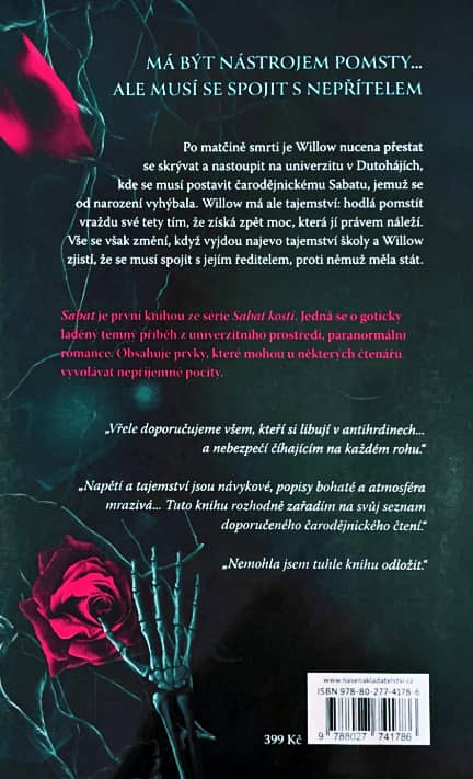 Co na příběhu ale musím pochválit, jsou popisy. Sabat je plný popisů emocí, prostředí nebo fungování samotné magie. Willowina přírodní magie je kouzelná nejen obsahem, ale i formou. Autorka používá nádherný, jemný jazyk a některé pasáže opravdu hladí po duši. Třeba scéna, ve které Willow pomáhá uvadlým rostlinám znovu rozkvést, je dojemná a silná.