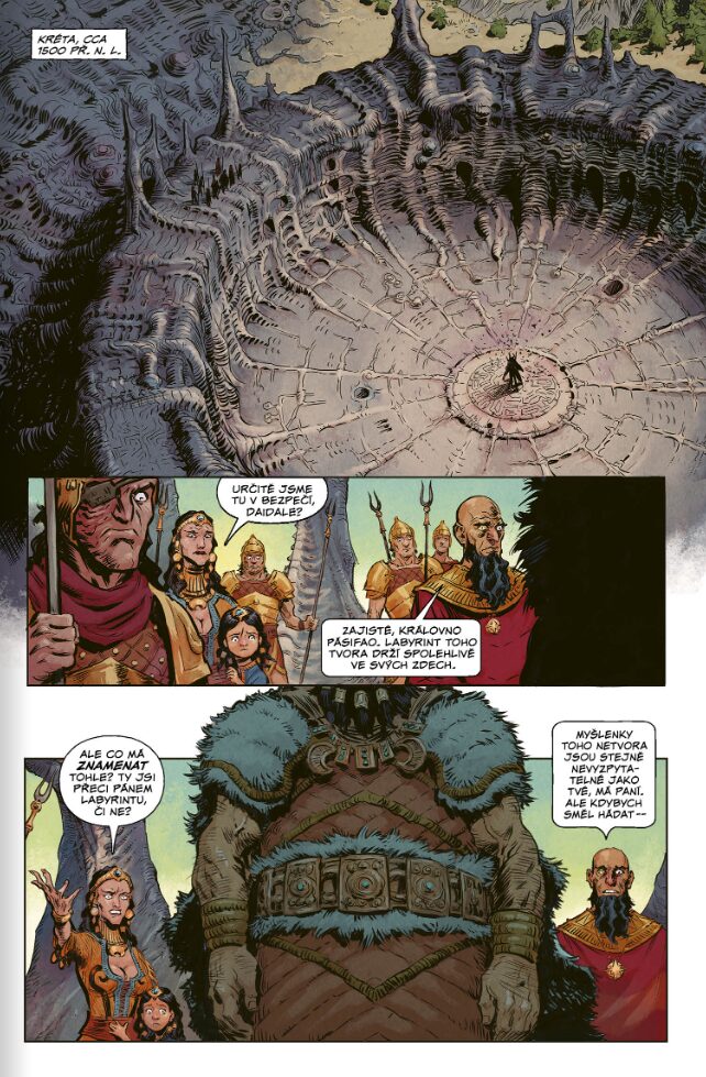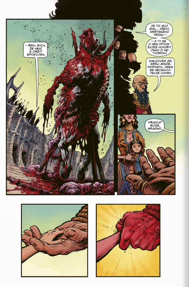 Ústřední monstrum, samotný Mínótauros, si zaslouží zvláštní pozornost. Běžně vžitá představa zvířecí stvůry s býčí hlavou je zde podrobena velmi neotřelé a překvapivé dekonstrukci. Z pochopitelných důvodů nelze zabíhat do konkrétních detailů, abych vás neochudil o pointu, nicméně toto specifické vyobrazení patří k absolutně nejlepším a nejoriginálnějším nápadům celé knihy.