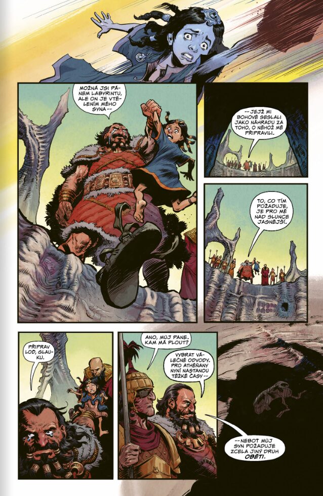Pokud tedy čekáte klasické, uhlazené vyprávění v duchu oblíbených řeckých bájí od Eduarda Petišky, budete muset svá očekávání rychle přehodnotit. Tvůrčí duo Chris Pasetto a Christian Cantamessa, z nichž druhý jmenovaný sbíral ostruhy při tvorbě gigantických videoherních hitů jako Red Dead Redemption či Rise of the Tomb Raider, přistupuje k předloze s dravostí typickou pro americké velkofilmy. Samotné postavy procházejí radikální proměnou. Z udatného Thésea se stává poněkud nezodpovědný hejsek, Ariadna mění pověstnou nit za luk a krétský vládce Mínós je zde vykreslen jako naprostý, krvežíznivý šílenec.