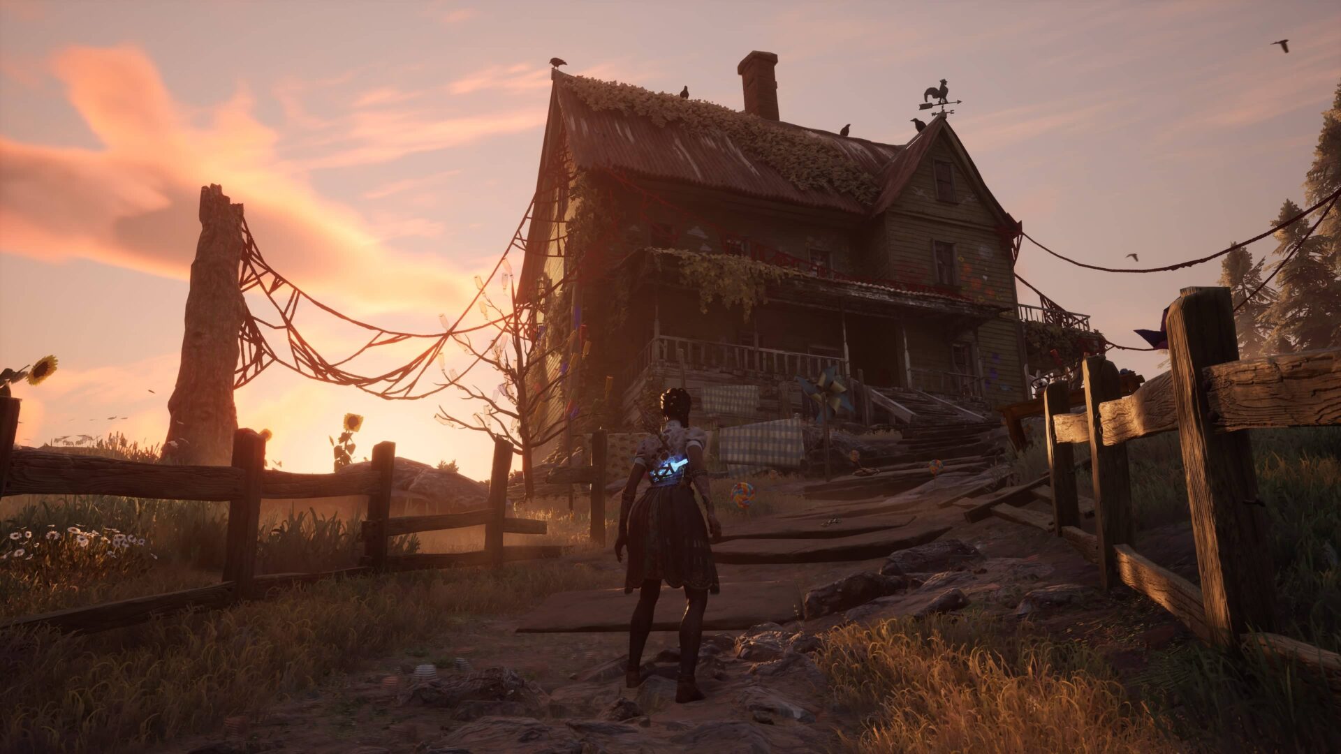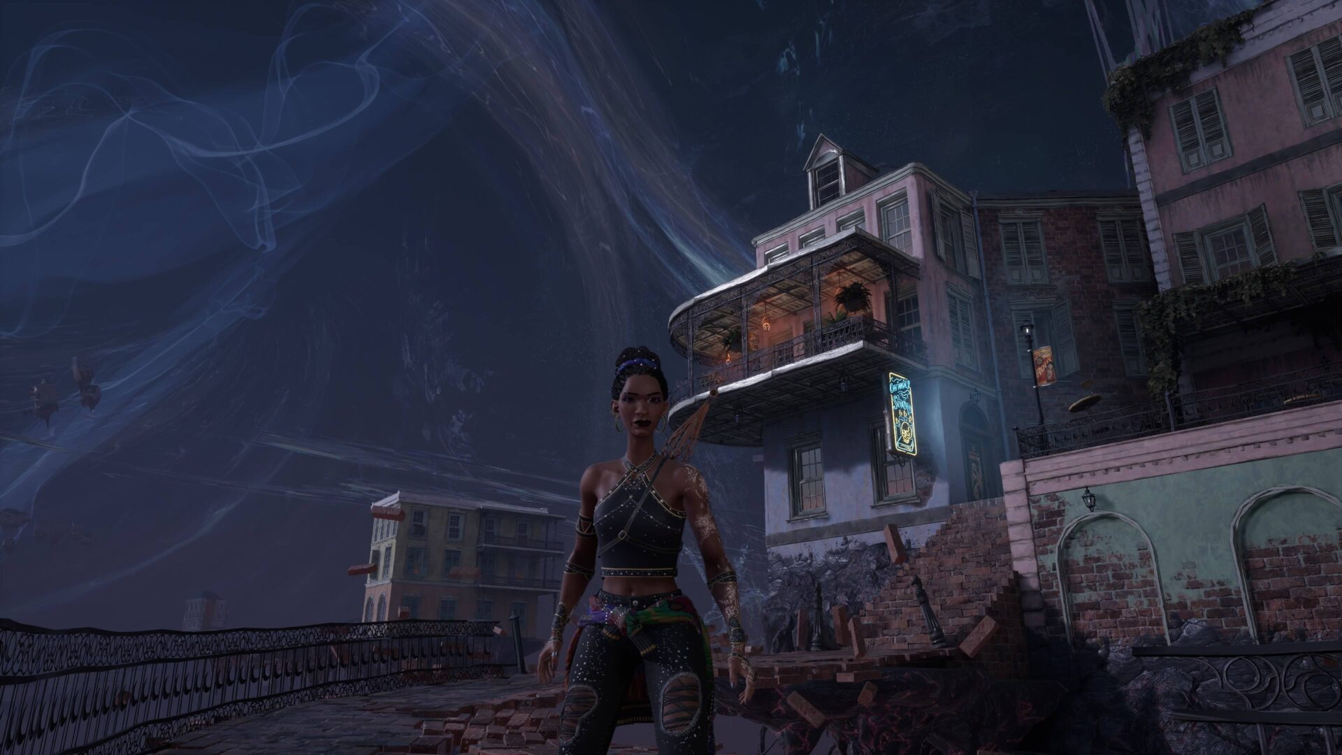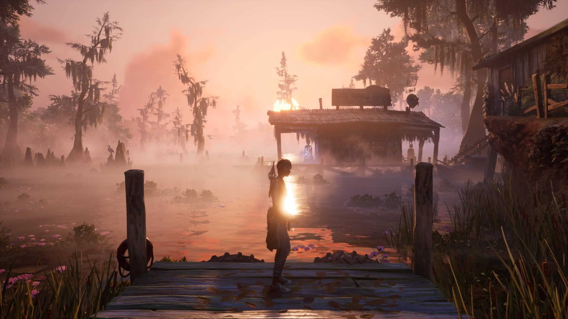 South of Midnight se odehrává na jižanském venkově v okolí fiktivního městečka Prospero a musím přiznat, že zdejší prostředí mi učarovalo na první pohled. Úvodní lokaci tvoří kdysi dávno osídlené, dnes však opuštěné domky, které se propadají do bažin. Pokud pamatujete hry jako Ghosthunter či Infamous 2 nebo jste viděli film Flynn Carsen 3: Jidášův kalich, pak víte, o čem je řeč. Záhy navštívíte zemědělskou oblast, která je však v důsledku hurikánu z velké části pod vodou. Voda je navíc silně znečištěná, a musíte se jí proto za každou cenu vyhnout. Zavítáte do hor, na uzavřenou pilu a osadu vybudovanou pro její zaměstnance. Vše je graficky moc pěkně zpracováno, obzvlášť hra světel a stínů nemá chybu. Menším zklamáním pro mě byly jen poslední dvě lokace, z nichž jedna byla příliš temná a fádní a druhá na můj vkus až příliš fantaskní.