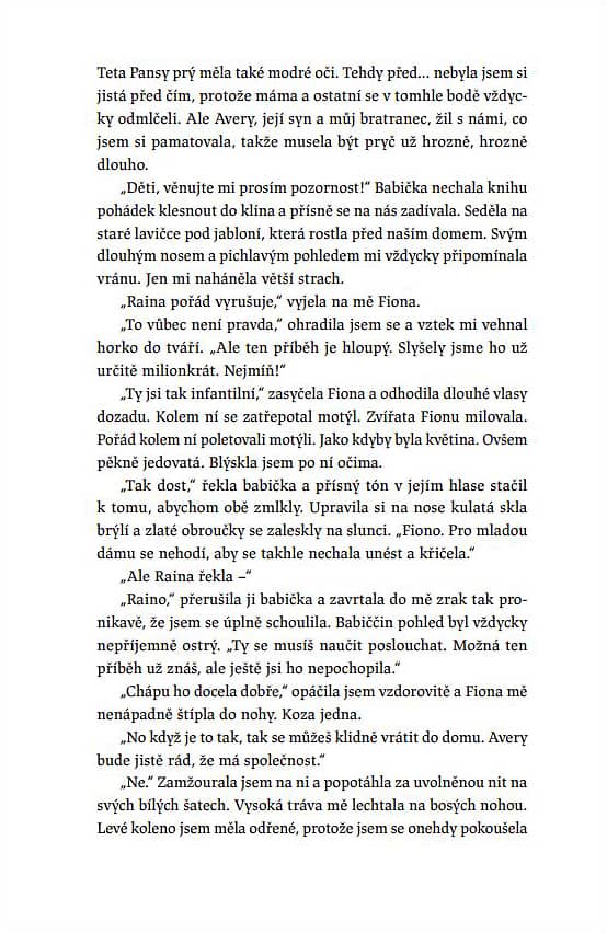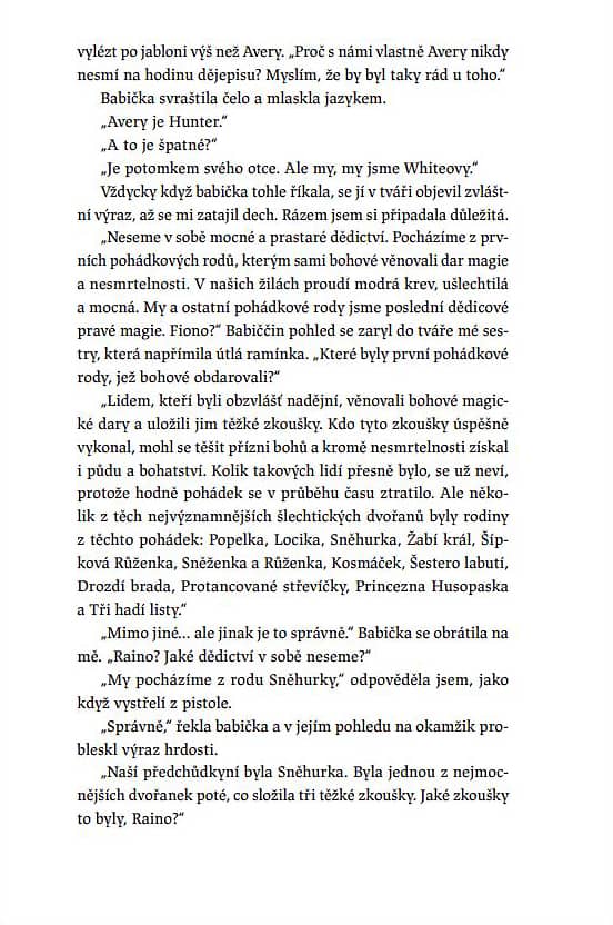 Raina považuje celou historii pohádkových postav za nesmysl. Vždyť její prapředek žil před stovkami let a dnes už jsou všichni potomci prakticky obyčejní lidé. Bez magie nejsou o nic výjimečnější než ostatní – přesto si dál hrají na aristokraty, žijí v přepychových sídlech a jejich životy bedlivě sledují paparazzi. Její babička je na svůj původ nesmírně hrdá, jenže má smůlu: Raina si z rodinných tradic nic nedělá. Jediné, po čem touží, je obyčejný život a čím víc se blíží její osmnáctiny, tím silněji odmítá hrát hru, která jí byla vnucena.