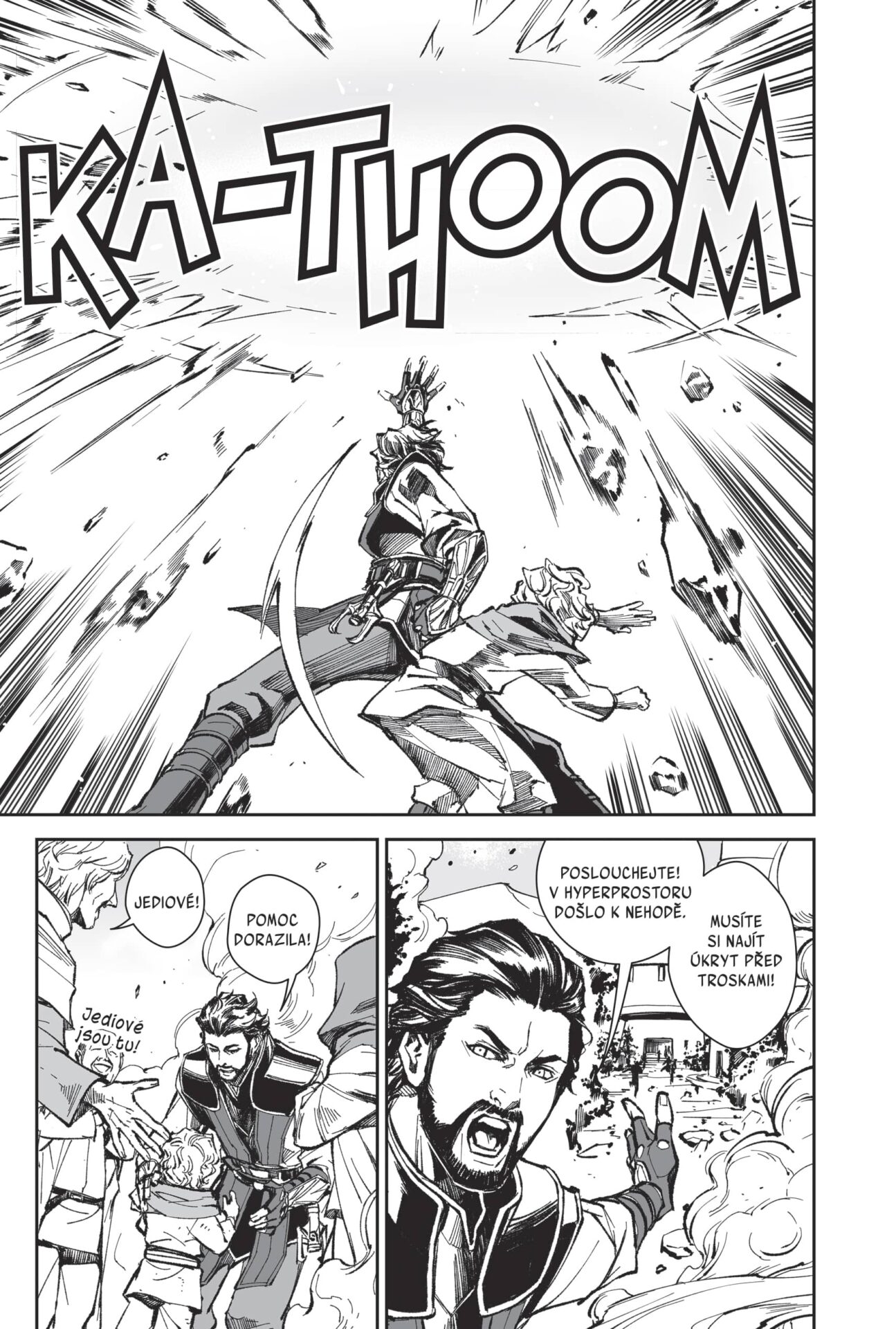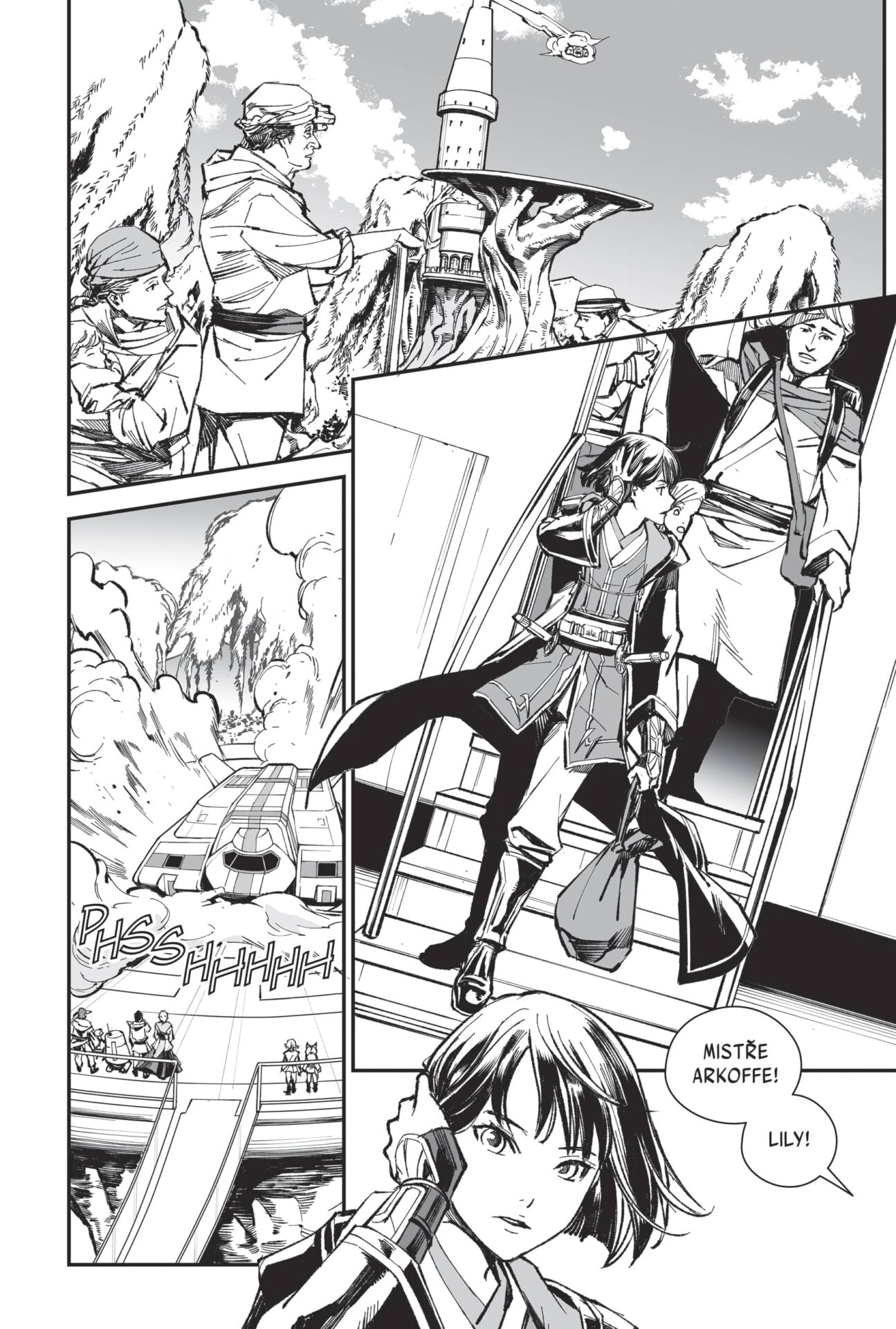 Rozložení panelů rovněž dobře funguje. Oceňuji navíc, když obzvláště v akčních pasážích kresby panely přesahují. Mistr Arkoff ve skoku je prostě něco, co vás nadchne, a dva světelné meče mistryně Lily k takovým obrazům také perfektně pasují. Ono s těmi drengiry muselo být hodně práce a to já dovedu ocenit.