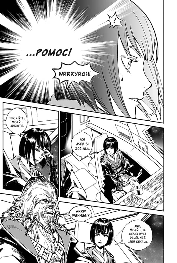 Baví mě i wookieeský mistr Arkoff. V jednu chvíli ho Stellan nazve příliš přísným na svoji bývalou padawanku, ale upřímně, já jsem na Arkoffově straně. Nicméně styl, jakým si manga poradila s překladem wookieeské řeči, mi moc nesedl. Zatímco Arkoff má vedle sebe bublinu s „Aaaarrrggghhh”, hned po něm nějaká postava opakuje, co řekl, jako kdyby se ujišťovala, jestli to opravdu řekl. Možná by bylo praktičtější mít překlad hned pod jeho výkřiky a zopakovat je jen, když Ratolesti netuší, co mistr říká.