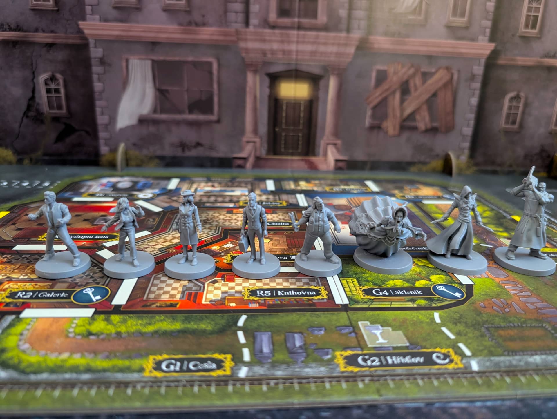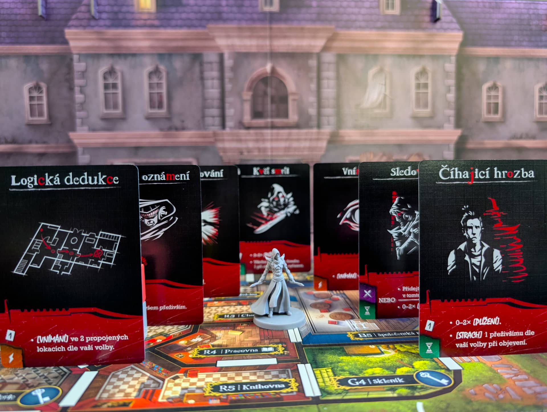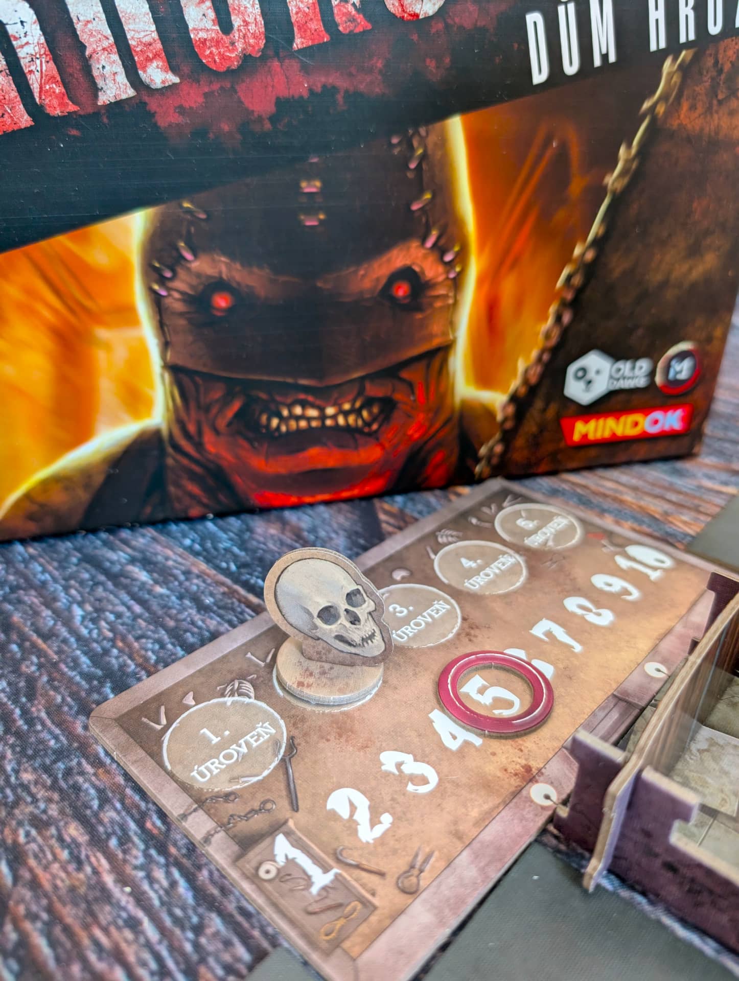 Atmosféra je dokreslena především skvělou produkční kvalitou. Jasně, cenovka na hře je trochu vyšší, ale obsah za ni rozhodně stojí. Hra obsahuje jedinou zástěnu, která doopravdy funguje. Mezi přeživšími a zabijákem je totiž veliká maketa domu, na jehož střeše jsou nejrůznější důležité ukazatele (například jak moc se kdo bojí nebo kolik klíčů již přeživší nasbírali) a v jednom boku je integrovaná kostková věž. Jediná vada na kráse je to, že tuto perfektní zástěnu musíte při každé partii složit a rozložit… nebo si ji nechat jako dominantu svého deskoherního pokoje. Druhá věc, která by podle mě hru ještě zdokonalila, je, pokud by ke každému zabijákovi byl oficiální soundtrack. Protože ačkoliv si u her obvykle hudbu nepouštím, tady partii dodává grády. Drobný detail na závěr: jména přeživších jsou odkazy na slavné hororové tvůrce, což je krásné pomrknutí na hráče.