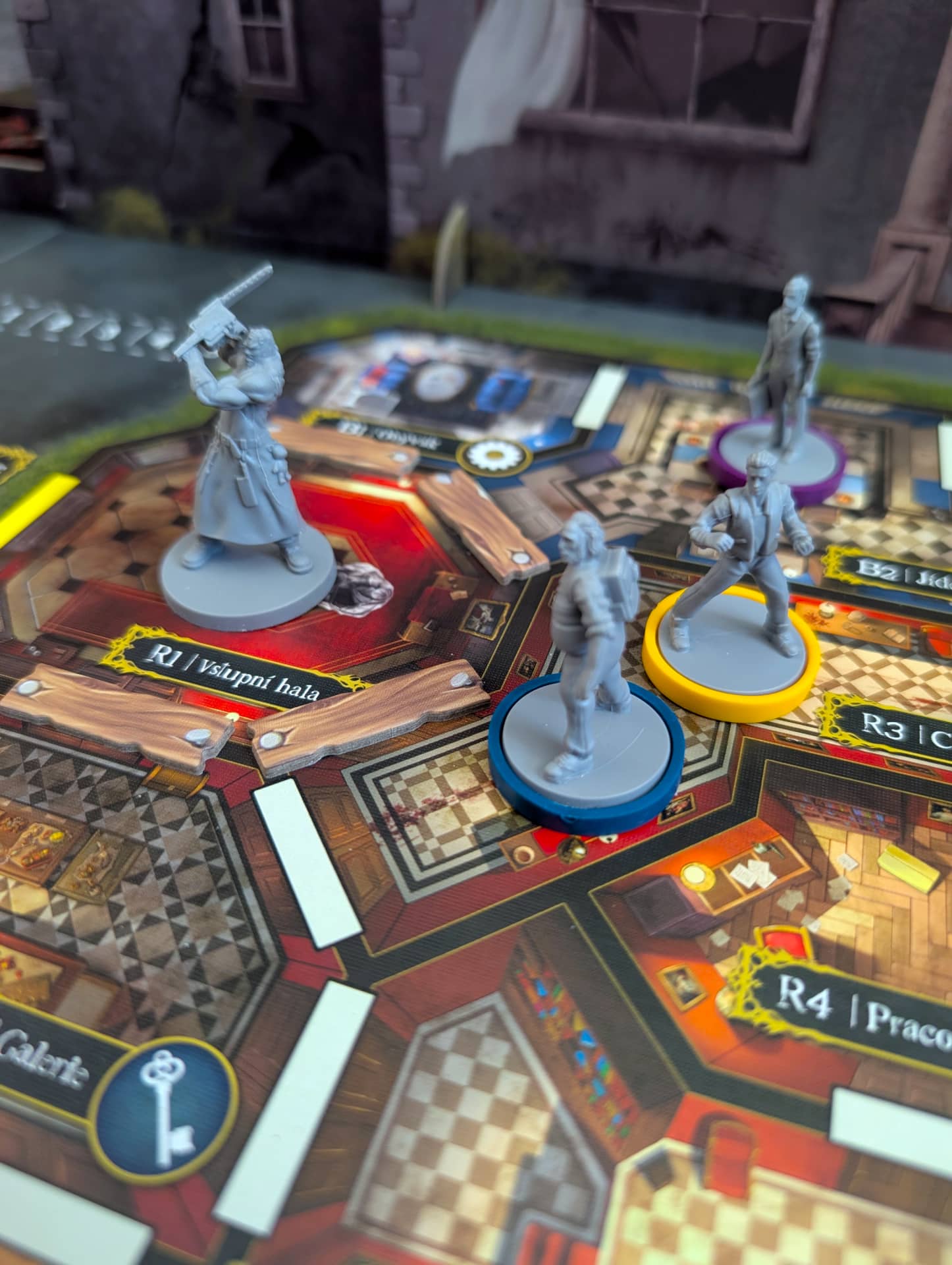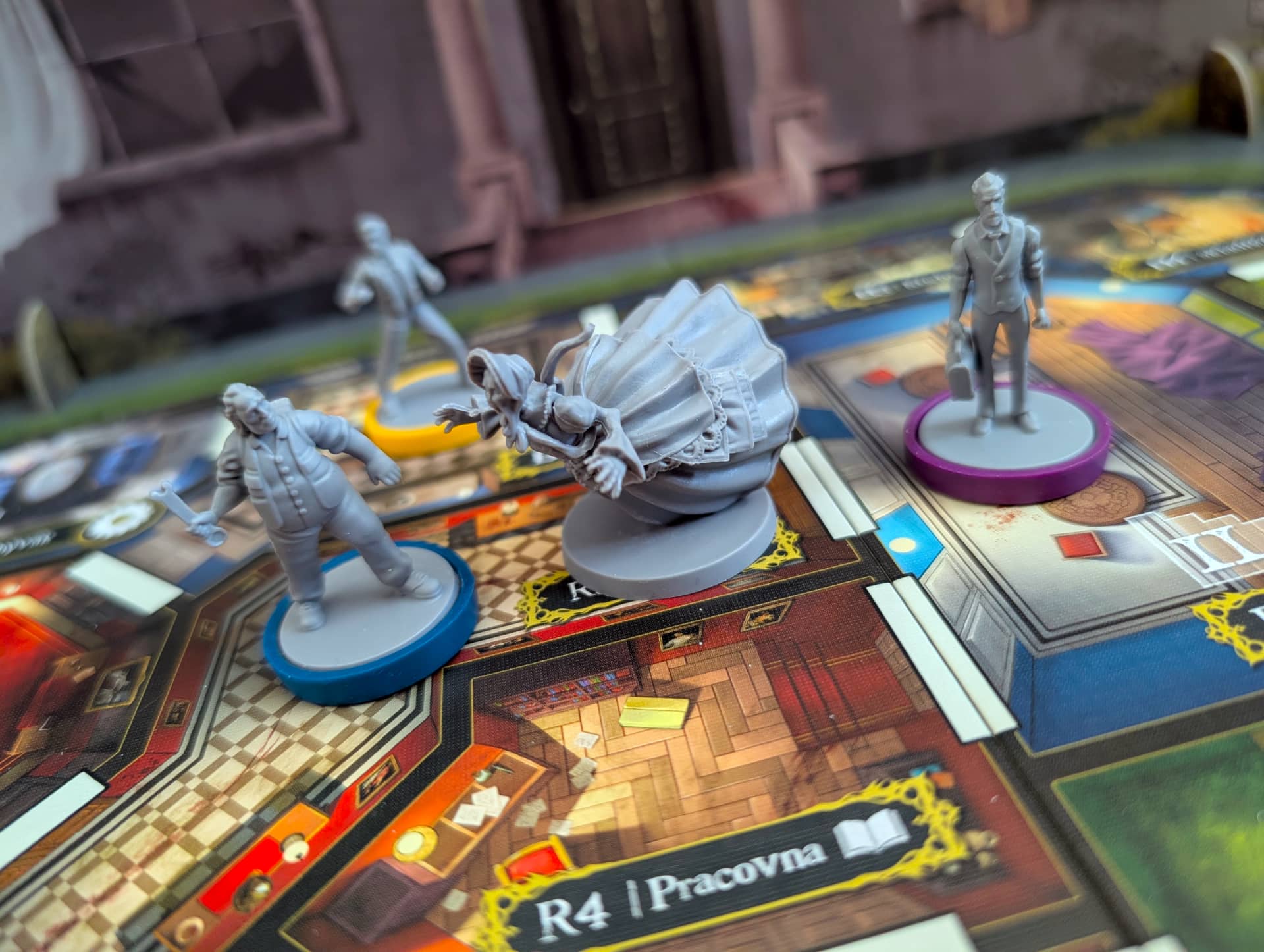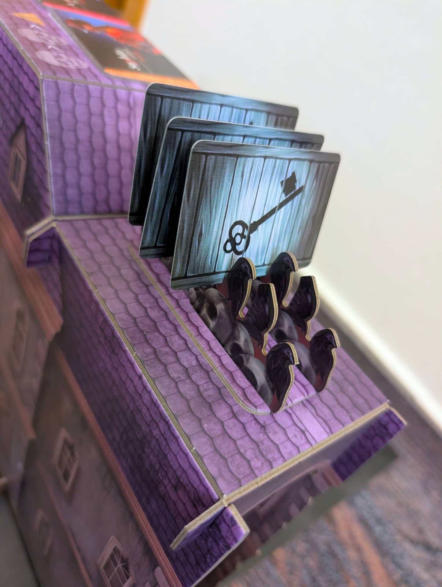 Atmosféra je dokreslena především skvělou produkční kvalitou. Jasně, cenovka na hře je trochu vyšší, ale obsah za ni rozhodně stojí. Hra obsahuje jedinou zástěnu, která doopravdy funguje. Mezi přeživšími a zabijákem je totiž veliká maketa domu, na jehož střeše jsou nejrůznější důležité ukazatele (například jak moc se kdo bojí nebo kolik klíčů již přeživší nasbírali) a v jednom boku je integrovaná kostková věž. Jediná vada na kráse je to, že tuto perfektní zástěnu musíte při každé partii složit a rozložit… nebo si ji nechat jako dominantu svého deskoherního pokoje. Druhá věc, která by podle mě hru ještě zdokonalila, je, pokud by ke každému zabijákovi byl oficiální soundtrack. Protože ačkoliv si u her obvykle hudbu nepouštím, tady partii dodává grády. Drobný detail na závěr: jména přeživších jsou odkazy na slavné hororové tvůrce, což je krásné pomrknutí na hráče.