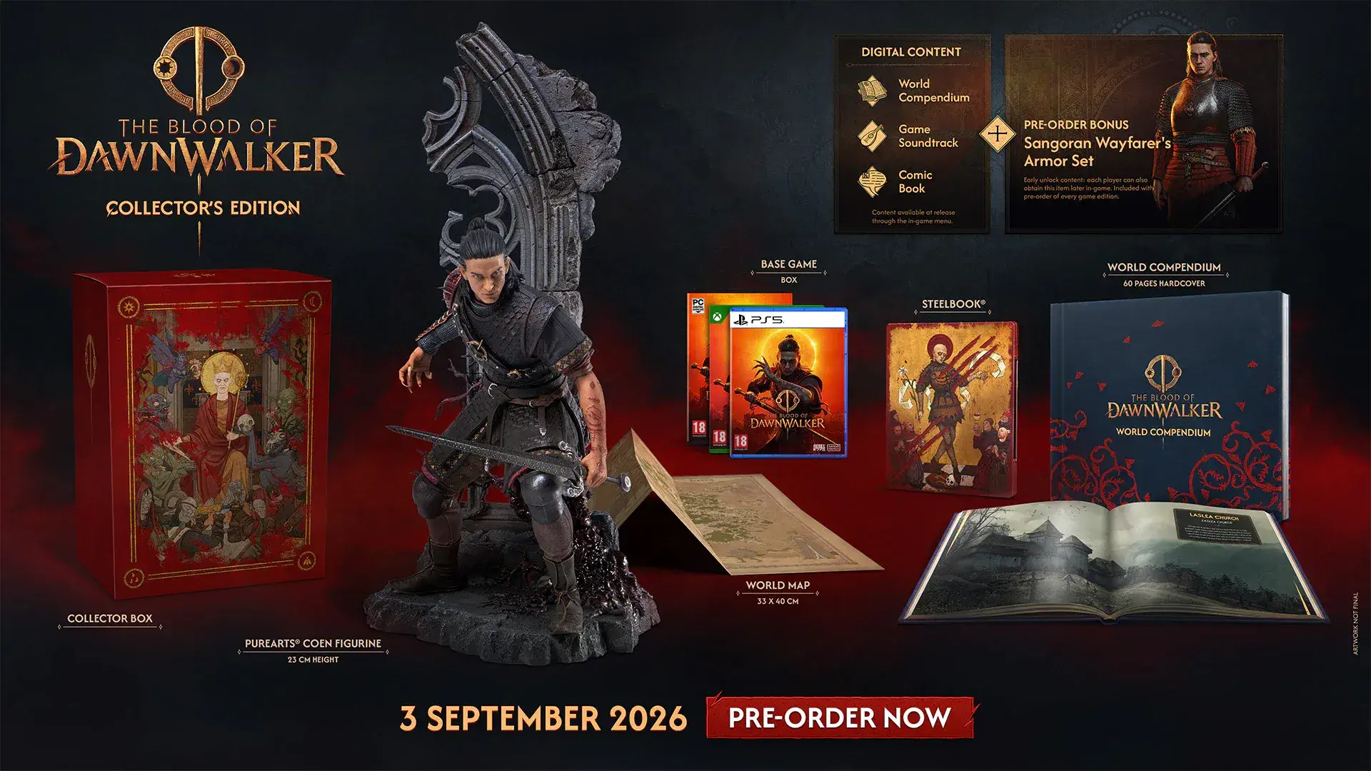 The Blood of Dawnwalker vychází 3. září 2026 a kromě základní hry za 69,99 € bude k dostání také Eclipse Edition s digitálním soundtrackem, artbookem, komiksem a přehledem světa za 79,99 €. Sběratelské edici za 199,99 € kromě hromady fyzického i digitálního obsahu dominuje figurka hlavního hrdiny (23 cm).