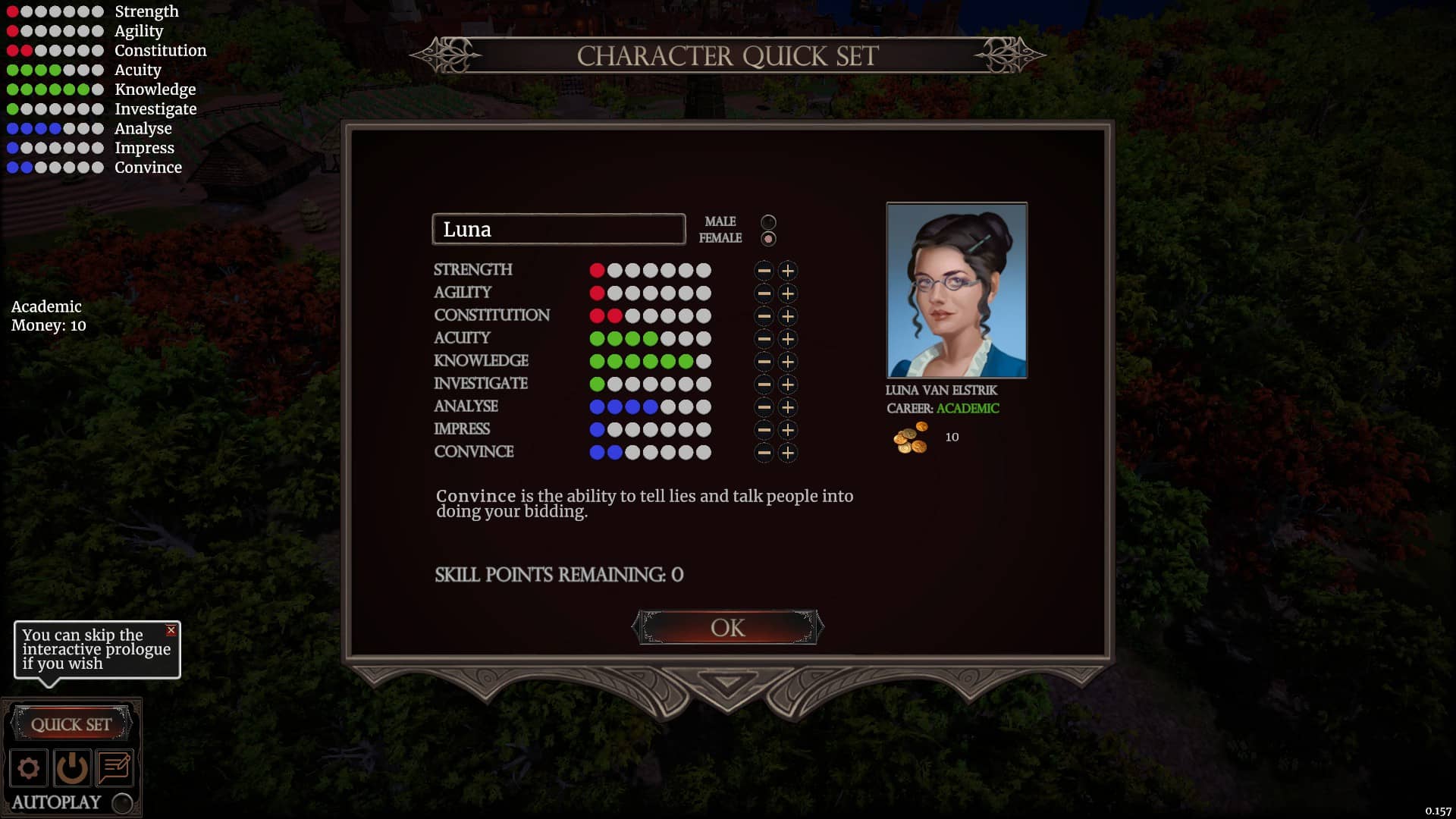 Tvorba postavy probíhá skrze interaktivní a plně namluvený příběhový úvod, který definuje vaše pohlaví, raný život, dovednosti a kariéru. Toto je fantastický způsob, jak postavu personalizovat hned od začátku a vplést ji do světa. I když se vám nelíbí statistiky, které z těchto voleb vyplynou, můžete je volně přerozdělit, což je vstřícný krok pro hráče hledající optimální build. Kromě jména a outfitu je vizuální přizpůsobení postavy spíše slabší – model postavy z top-down pohledu není přímo upravitelný. Nicméně, vaše postava má portrét používaný v dialogových oknech, který můžete nahradit vlastním obrázkem, což je velmi povedená funkce pro roleplay.