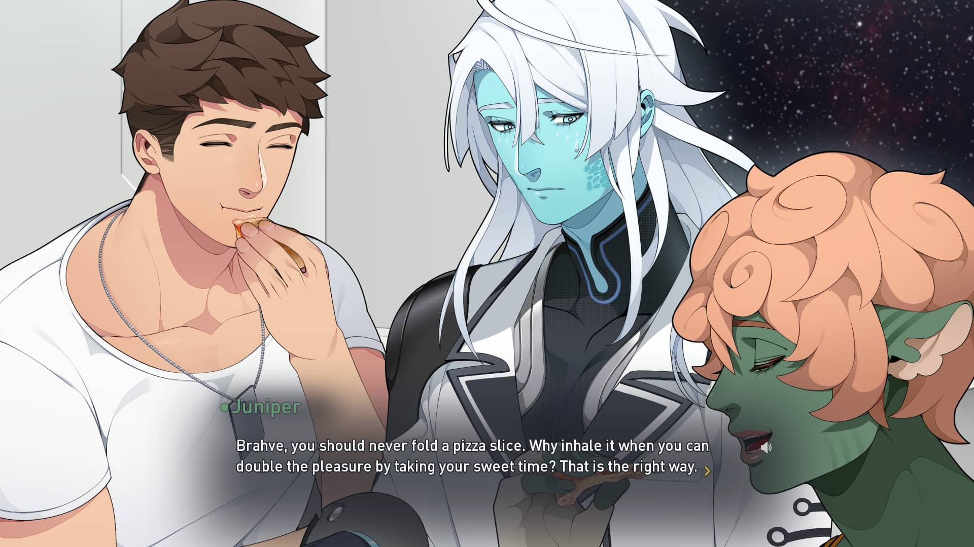 Váš hratelný protagonista jménem Danya je pilot lodi, který sice působí na první pohled jako běžný vesmírný žoldák, ale pod povrchem se skrývá zvídavý chlapík, připravený na nové zážitky. A že jich bude. Dále se zde setkáváte s Juniper. Danyovou mimozemskou kamarádkou a parťačkou. Loajální, možná trochu cynickou, ale hlavně podporující. Další hlavní postavou je Brahve. Tajemný, krásný mimozemšťan s neodolatelným charisma a no, něčím víc. Je tím katalyzátorem, který rozčeří klidné vody Danyova života a rozpoutá doslova sexuální bouři. Poslední postavou je pak Symbiant (ten, co je uvnitř). Jedná se o další postavu, která sice nemá ústa, ale zato má spoustu chapadel. A věřte mi, nudit se s ním rozhodně nebudete.