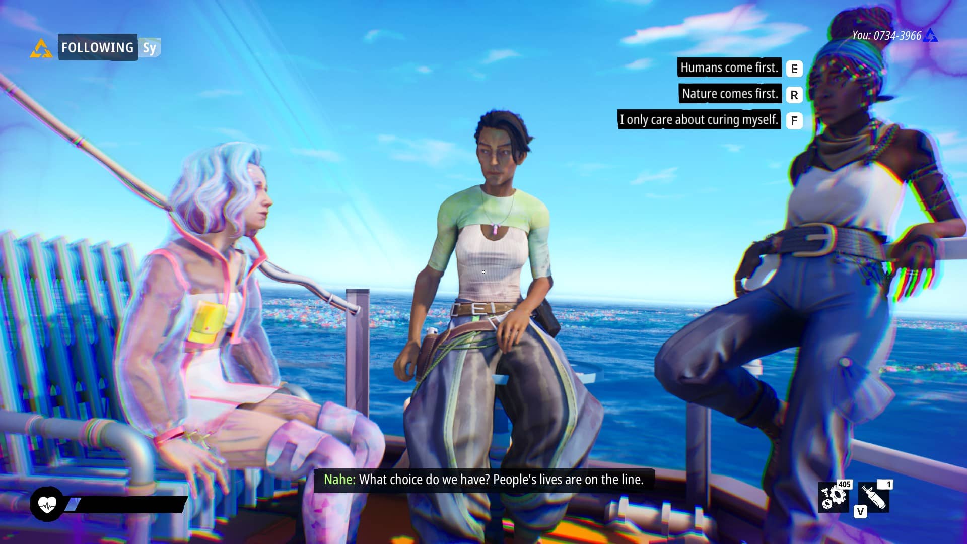 Z pohledu mechanik se Tides of Tomorrow drží osvědčených prvků narativních adventur, ale nebojí se přidat větší míru interaktivity než například Road 96. Nečekejte však komplexní soubojový systém ani náročné hádanky. Valnou většinu času strávíte průzkumem světa, rozhovory a nelehkými volbami. Mezi jednotlivými lokacemi se přesouváte na lodi a vybíráte si, kam se vydáte dál. Každá oblast nabízí něco jiného, ať už jde o příběhové momenty, nebo možnost doplnit tolik potřebné zásoby ozenu nějakou vedlejší aktivitou, jako je potápění, lodní bitvy, závody s lehce krkolomným ovládáním nebo třeba smlouvání s obchodníky.