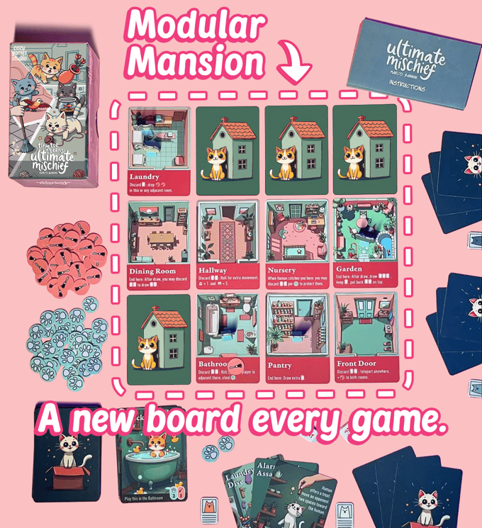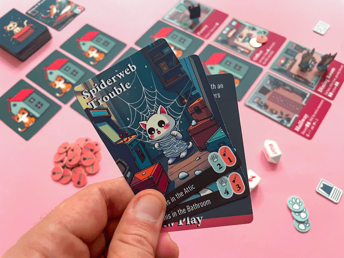 Každá partie karetní hry začíná stavbou modulárního domu z vybraných místností. Ty jsou zpočátku otočené lícem dolů a hráči je odhalují až při vstupu. Každý pokoj má vlastní pravidla a především specifické karty neplechy, které lze zahrát jen na správném místě. Hra tak podporuje pohyb po mapě a nutí hráče plánovat trasu, načasování i to, kdy se vyplatí zůstat na místě a kdy raději zmizet. Průběh tahu je jednoduchý, ale nabízí překvapivě dost možností. Hráči si nejprve hodí kostkou pro pohyb, poté se přesouvají po domě a mohou zahrát až dvě karty. Zajímavým prvkem je možnost jednu kartu zahodit, buď pro extra pohyb, nebo pro přidání chaosu do místnosti. Právě chaos je klíčem k bodům, ale zároveň největším rizikem.
