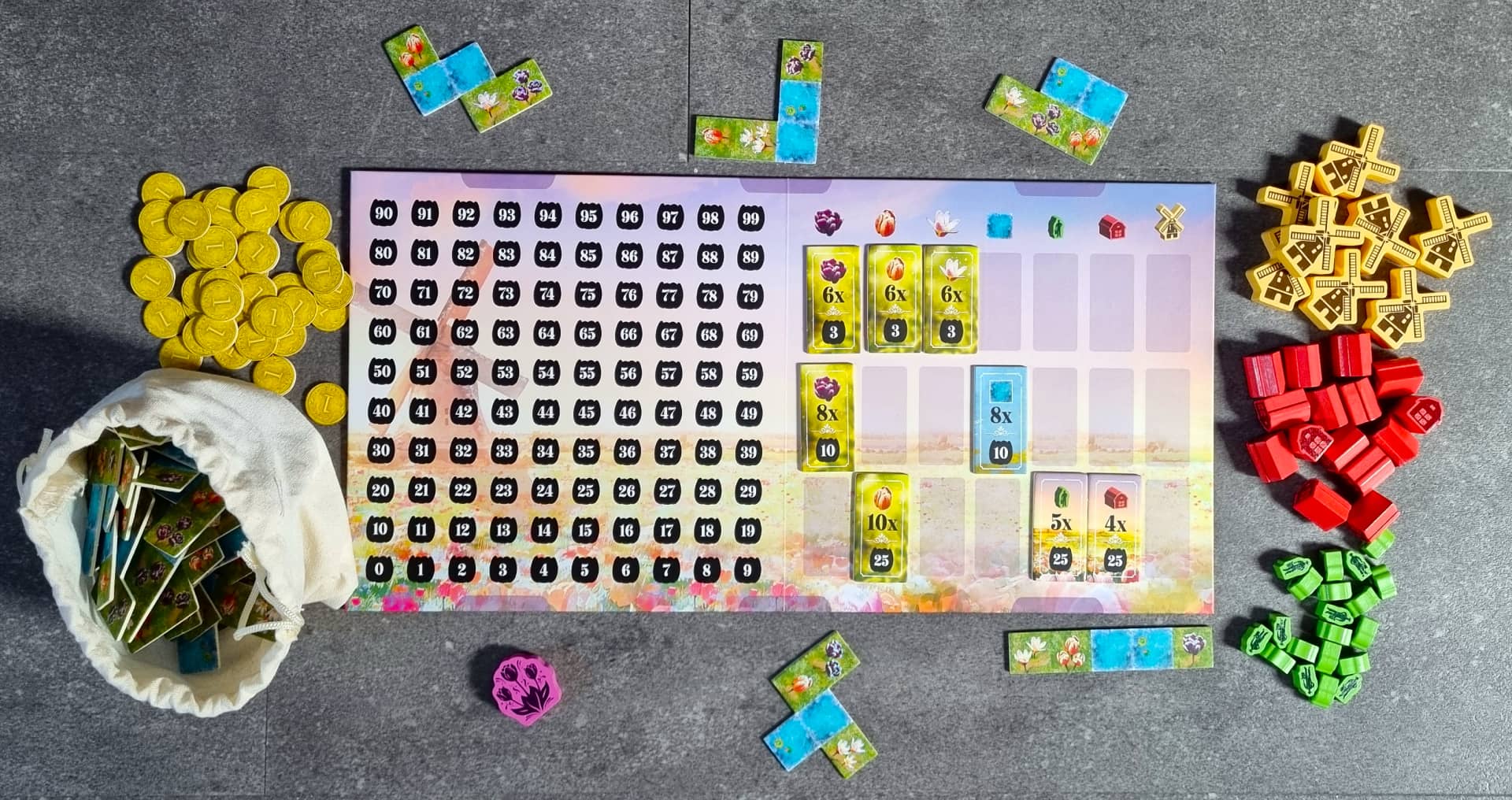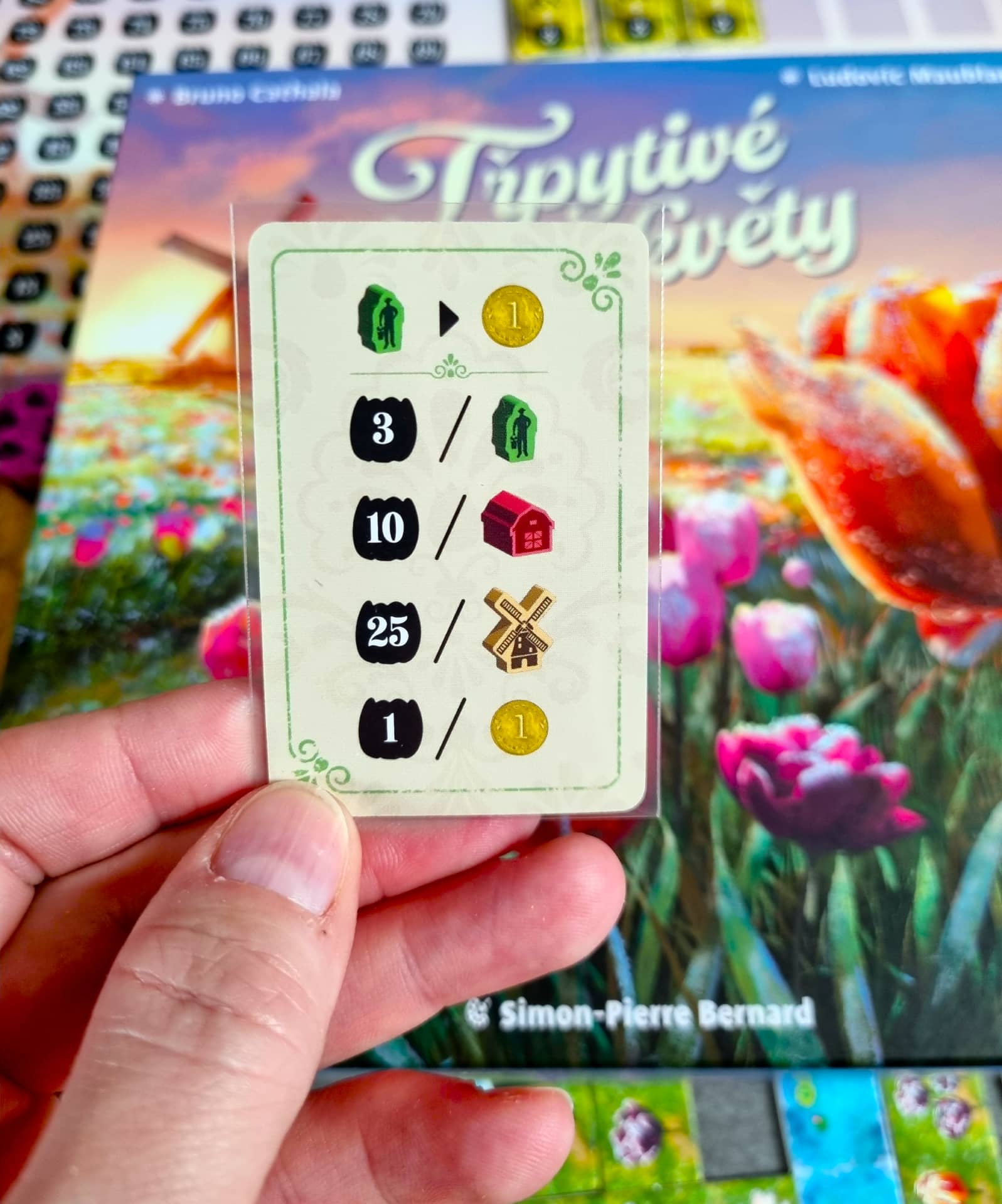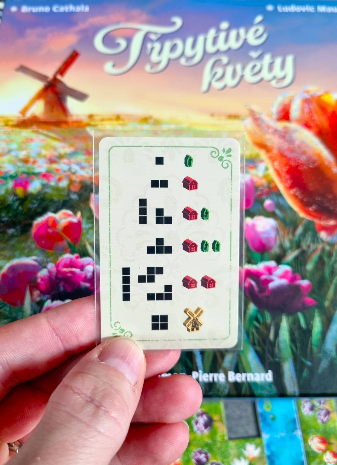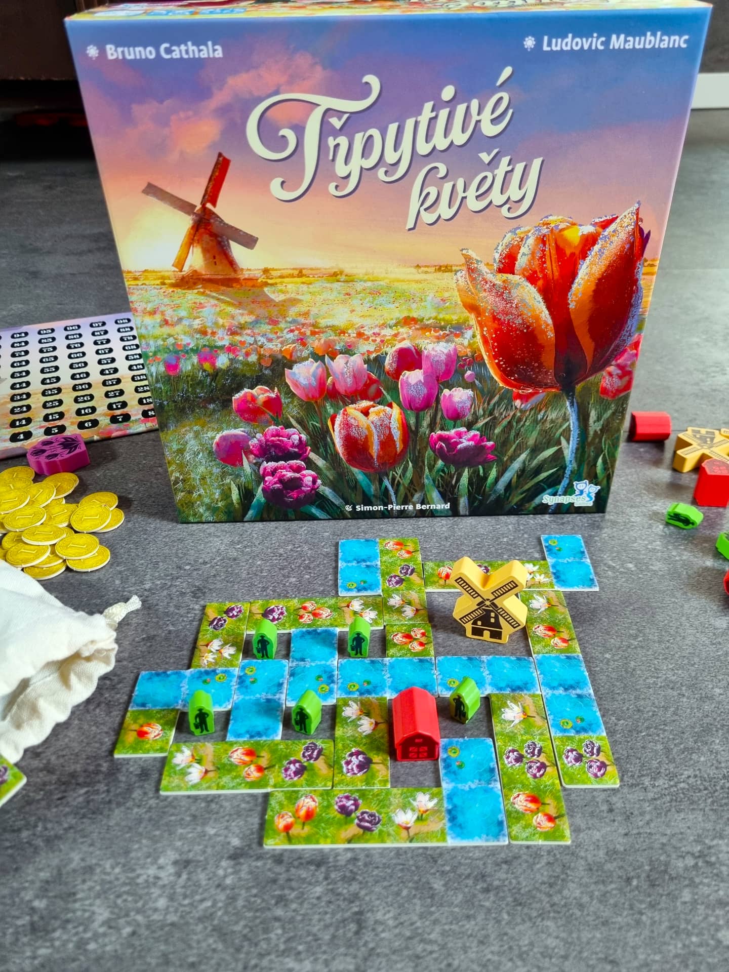 Srdce každé straky zaplesá hned po otevření krabice. Čeká vás vylupování tetrisových dílků s ilustracemi květin, které se opravdu třpytí. Atmosféru jemě lesknoucí se námrazy tu vyvolává použití stříbrné barvy. Na rostoucí zahradu ve vašem herním prostoru je tak radost pohledět. Zvlášť, když přidáte potištěné dřevěné žetony vylepšení v podobě větrných mlýnů, stodol a pracovníků. Mně se také velmi líbí přebal krabice, i když musím přiznat, že na první pohled jsem hru považovala za rozšíření k Údolí tulipánů. A nebyla jsem jediná, kdo tyto dva tituly při zběžném obhlédnutí zaměnil.