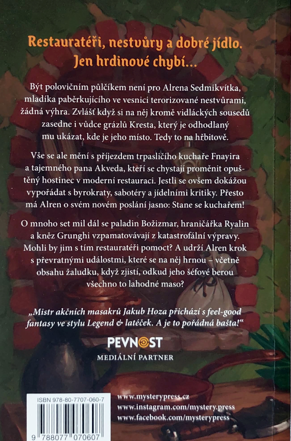 Příběh nás hned na začátku seznámí s naprosto fantastickým triem hlavních hrdinů. Máme tu polovičního půlčíka Alrena Sedmikvítka, který to ve své domovské vidlácké vesnici nemá vůbec jednoduché. Terorizují ho nejen lokální nestvůry, ale také místní grázl Kresta, který by ho nejraději viděl na hřbitově s kytkou na břiše. Všechno se ale obrátí naruby, když do vesnice dorazí nesmírně tajemný pan Akved a svérázný trpasličí šéfkuchař Fnayir (nebo také Kovostisk, což je jméno, které si stejně jako já za boha nezapamatujete, ale vůbec to nevadí). Tito dva exoti mají totiž naprosto šílený plán. Proměnit starý, zchátralý a opuštěný hostinec v luxusní moderní restauraci, kam se budou všichni sjíždět na vybrané lahůdky z monster. Alren tak dostane životní šanci na pořádné dobrodružství a s nadšením se vrhá do kuchařského řemesla.