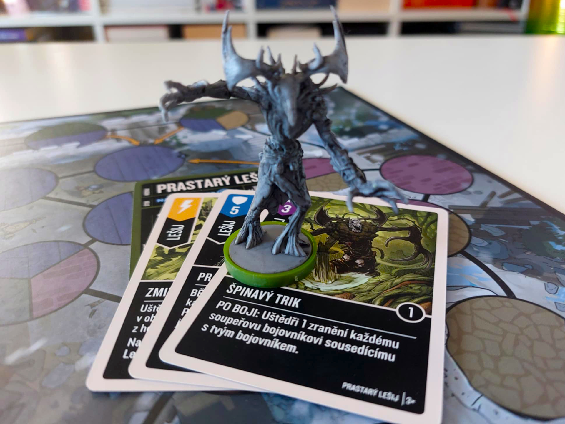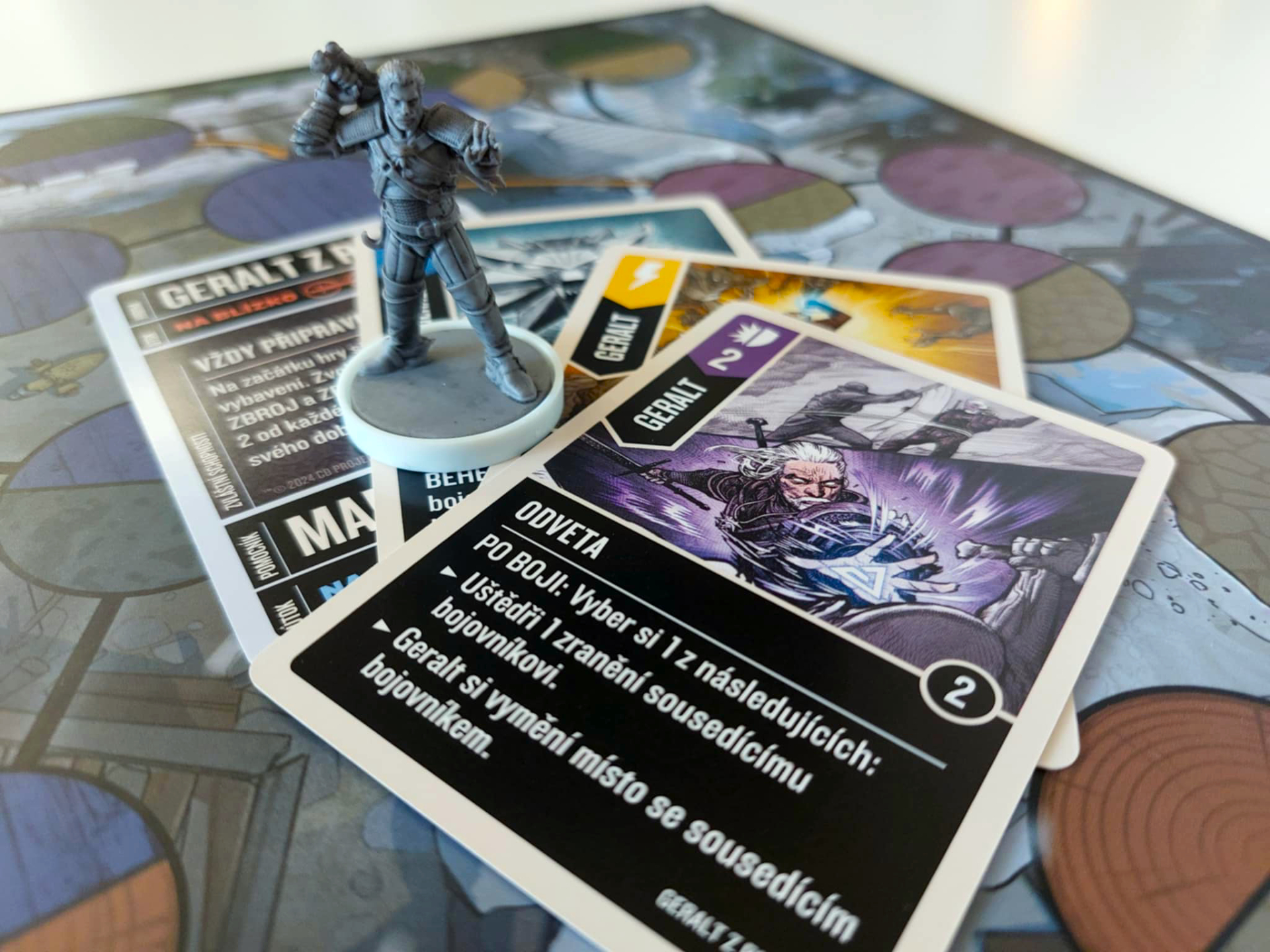 A nakonec je tu vizuální stránka, která je naprosto špičková. Každý hrdina má svůj vlastní, unikátní výtvarný styl karet, který skvěle vystihuje jeho charakter (ilustrace pro Geralta a Lešije dělal Brick Alexander, pro Ciri Zoë van Dijk). Detailní figurky hrdinů a kvalitní žetony pomocníků vypadají na herním plánu skvěle. Přehledné karty postav, ukazatele zdraví a celkový grafický design jsou nejen krásné, ale i maximálně funkční a intuitivní, což přispívá k plynulému a příjemnému hernímu zážitku. Navíc já miluju animovaný herní design a tady se nemohu vynadívat, dokonce bych toho potřeboval i víc.