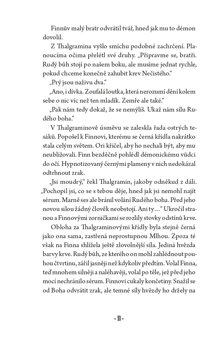 …určitě v knize nikdo neřekl. V tomhle světě je na nebesích jen jedna zářící hvězda, těleso či cokoliv, co se nachází na obloze. Rudý bůh. Každý, kdo se na něj podívá v jeho záři a není nadopovaný speciální látkou, nebo není lovcem, se poté promění v odpornou bestii, která je na takové pološílené hranici mezi hladovým upírem a démonem. Respektive alespoň tak mi to přišlo z popisu. Tato monstra jsou hnána pudy a vraždí vše, na co přijdou. Krásná premisa, že? Především mi povězte, kdo by v něčem takovém chtěl žít? Bohužel (vážně říkám bohužel, já bych to být nechtěl), naši hrdinové v něm žijí a nemají to vůbec jednoduché. Příběh se totiž točí kolem sedmnáctileté sestry Mladého Proroka Nefftari, jejímž nenápadným předurčením je zachránit svět, mladého bývalého otroka Scalva a nejlepšího, nejmocnějšího, nejudatnějšího, nejtalentovanějšího lovce Thaddea, který je z důvodu invaze démonů propuštěn z vězení, kde seděl za vyvraždění jedné rodiny. Takové velice veselé od začátku až do konce.