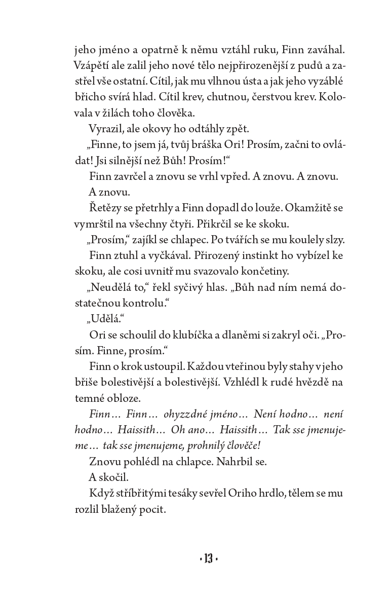 Pak je tu problém se jmény. Já rozumím tomu, že v Česku je žánr dark fantasy prakticky skoro nezastoupený, ale jsme v Čechách, chtělo by to nějaký jmenný úzus. Nefftari, Thaddeus, Mladý Prorok, Scalv, pak pár německých jmen, pár římských, jedno židovské, nahodile hebrejské, nikdy nezmíněné, honosně poloelfské, pár démonských. Nevím proč, nikdy jsem se nad jmény v knize nepozastavil, ale tady mě to neskutečně bilo do očí. Pro představu jak to myslím, na mě některé pasáže se jmény působily následovně: „Zdeněk šel sbírat houby, kdežto jeho dobrý přítel Ithuriel z domu Maroisiel ovládl západní větry, aby rozesel spory do zbytku světa.” Snad si rozumíme.