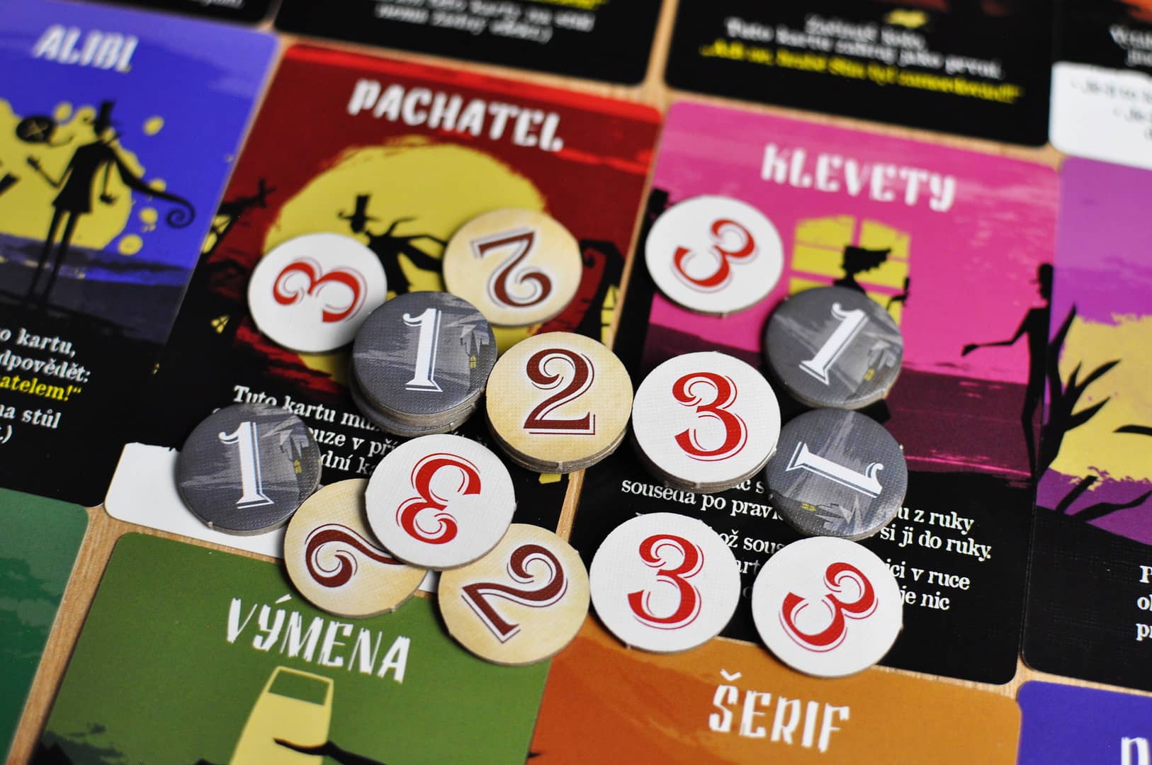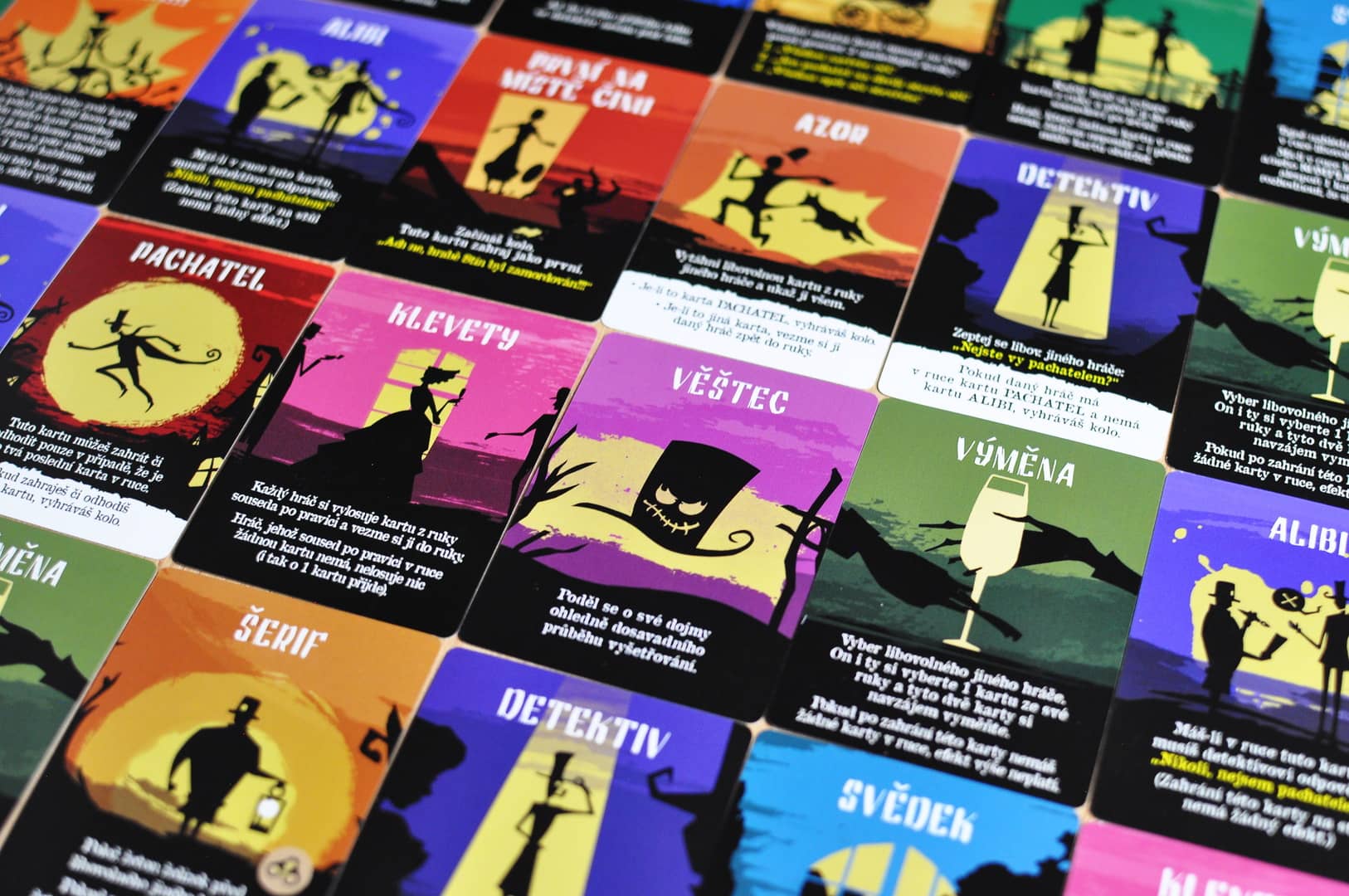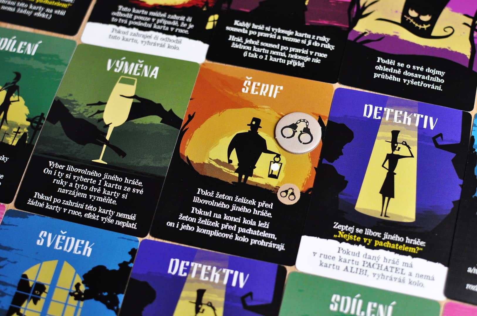 Skvělým příkladem je také karta Svědek. Díky ní se můžete podívat libovolnému hráči na karty v ruce, a pokud mezi nimi objevíte kartu Pachatele nebo Komplice, můžete se rozhodnout pro výměnu karet. V tu chvíli ale přichází velmi silný moment, kdy záleží čistě na vaší reakci. Řeknete, že k žádné výměně nedojde, čímž ostatním naznačíte, že dotyčný pachatelem není? Nebo řeknete, že si kartu vyměnit nechcete a necháte ostatní tápat v nejistotě? Nechcete, či nemůžete? Právě takové drobné nuance dokážou výrazně zahustit atmosféru jediné partie.
