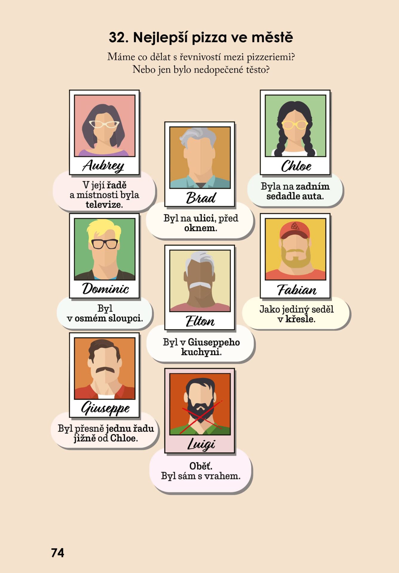 Podezřelí ve Vraždoku nemají obličeje v tradičním slova smyslu, přesto působí překvapivě živě. Jejich siluety, oblečení a drobné detaily v ilustracích jasně odrážejí téma dané hádanky. Na první pohled poznáte, kdo patří do opery, kdo na hokejový stadion a kdo na maškarní bál. Líbivým detailem je už zmíněné pojmenování postav podle písmen abecedy, kdy oběť obvykle začíná na písmeno V. Tento systém je nejen praktický, ale také elegantní a dodává celému konceptu lehce hravý nádech. Postavy jako by na vás z ilustrací po očku mrkaly, a i když nemají výrazné rysy, je snadné si představit, že vám někdo z nich celou dobu lže.