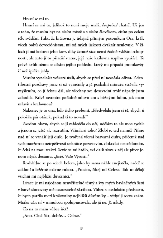 Přiznám se, že začátek tohoto fantasy příběhu mě nijak neoslnil. S Jade se setkáváme ve chvíli, kdy je na audienci u královny, a tahle pasáž pro mě byla vyloženě utrpení. Jsem zvyklá na silné hrdinky, a tady dostáváme vyděšenou holku, která se na konci schůzky z nervů pozvrací. Chápu, kam tím autorka mířila – ukázat nedokonalou, zranitelnou postavu, což vlastně cením… ale upřímně? Jade mi prostě nesedla. Panické ataky měla snad ob stránku a větu „dýchej, to bude dobrý“ jsem měla chuť začít recitovat ze spaní, jak často se v knize objevovala. Už od začátku jsem tak nějak tušila, že tohle úplně fungovat nebude.