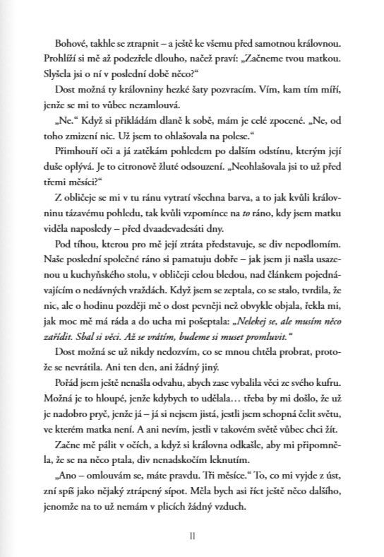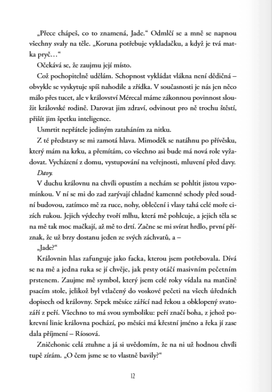 Všechno se ale změní ve chvíli, kdy zmizí její matka. Na truchlení však není čas. Její matka totiž zastávala pozici hlavní poradkyně královny, a královnu nějaké drama kolem jejího zmizení očividně vůbec netrápí. Jade se tak ocitá v nepříjemné situaci: buď do šedesáti dnů matku najde, nebo sama přijme místo královské vykladačky. A to ještě netuší, že do celého příběhu brzy zasáhne série vražd, které ji donutí konečně začít jednat.
