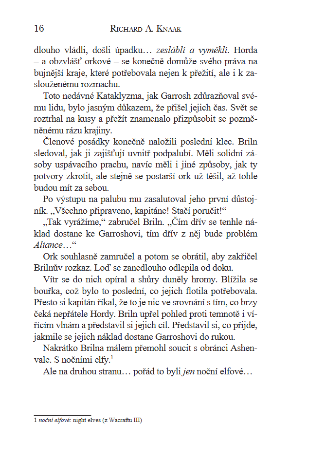 Jestli něco Richard A. Knaak umí, tak je to psaní akčních sekvencí. Bojové scény jakoby žily před vámi a dění v Ashenvale je naprosto brilantně sepsáno. Autor se toho vážně nebál a servíruje snad všechno, co předvedl ve Válce prastarých, Dni draka i Noci draka . Do toho vše propojuje skvělými dialogy, především ve vztahu otce a syna, tedy Anduina a Variana. Já tedy osobně mám daleko radši Anduina, protože Varian mi přijde trošku šílený, ale musím říct, že po této knize měním názor. Malinko.