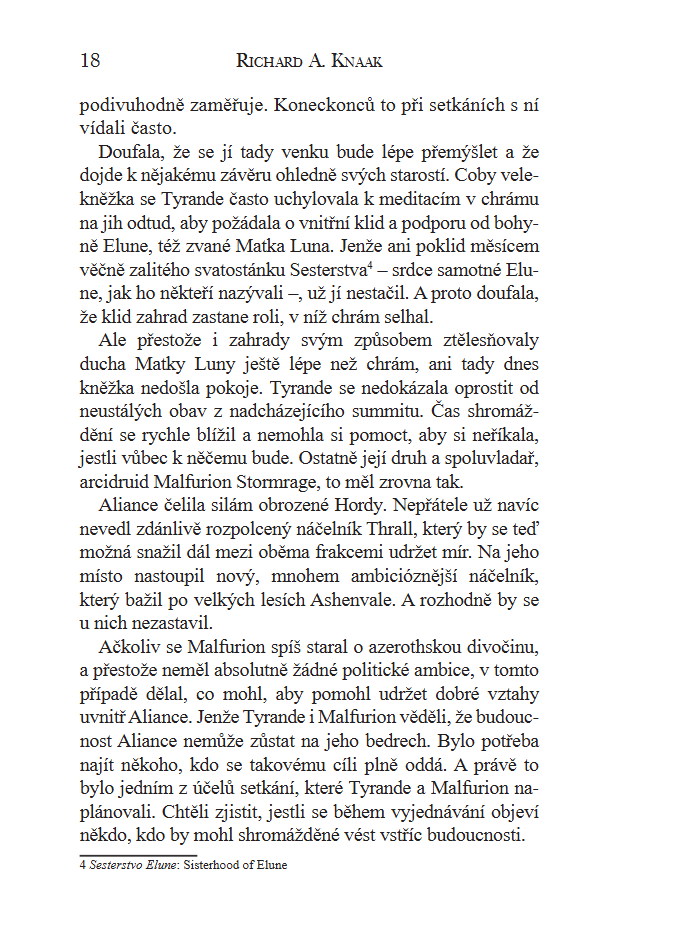 Najednou tu pak začíná skvělá detektivní zápletka, díky níž se vrací ikonické postavy. Vyšetřováním je pověřena Maiev Shadowsong, posedlá a nekompromisní strážkyně, která se vrací po porážce Illidana. Její fanatická povaha je zde vykreslena naprosto dokonale. Spolu s ní se na scénu vrací i její bratr Jarod. Kniha navíc dává obrovský prostor a aktivní roli Tyrande Whisperwind, která je zde zobrazena jako silná, schopná a rozhodná vůdkyně, což je vítaná změna oproti její často pasivní roli. Prostě a jednoduše, skvělá kombinace politiky, vražd, elfů, lidí a šílených zlých orků. Co víc chtít?