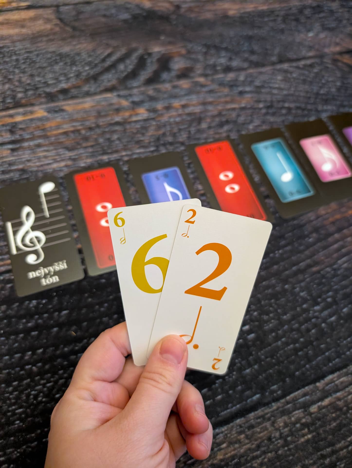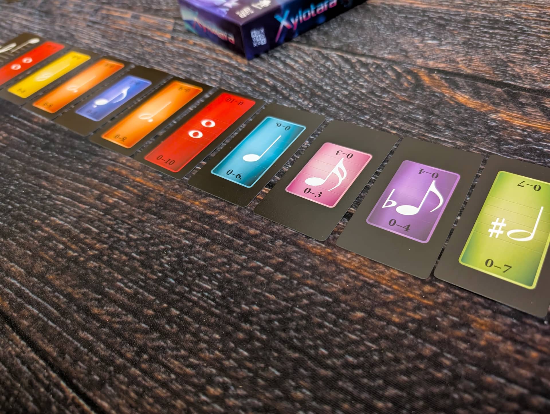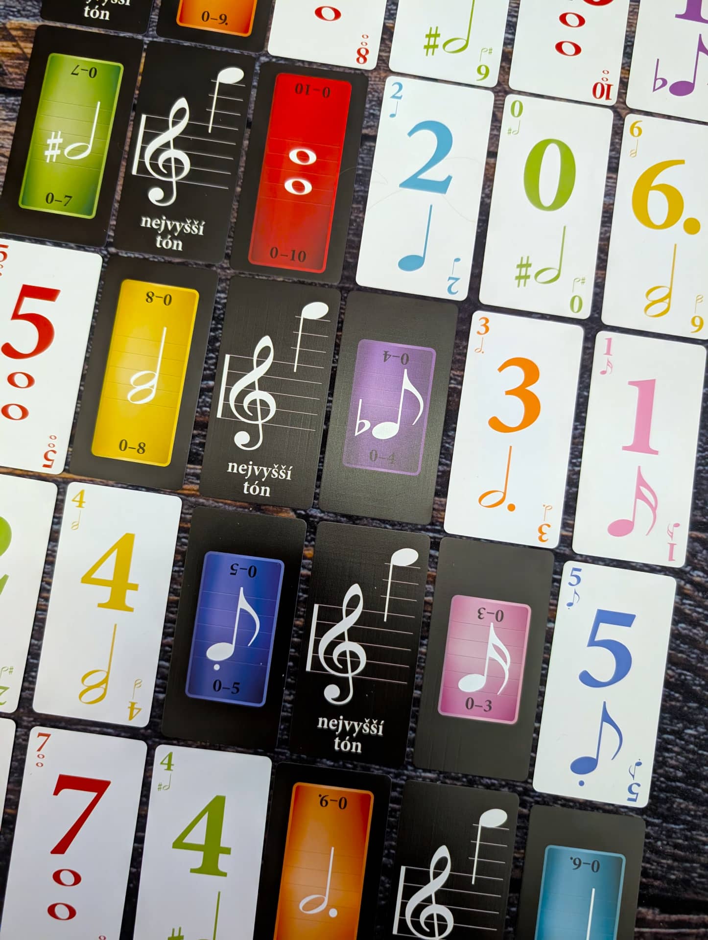 Prvním z nich je to, že karty nemáte v ruce, ale vyložené do řady před sebou od nejvyšší po nejnižší. Na rubu karet je vždy vidět barva, která odpovídá rozsahu možných hodnot. V balíčku se přitom nachází vždy jen jedna kopie každé možné kombinace barvy a hodnoty. Červené karty (tematicky odpovídající souzvukům celých not) mohou mít hodnoty 0–10, oranžové 3/4 noty 0–9, žluté souzvuky 1/2 not 0–8, zelené zvýšené 1/2 noty 0–7, modrozelené 1/4 noty 0–6, modré staccato 1/8 noty 0–5, fialové snížené 1/8 noty 0–4 a poslední růžové 1/16 noty 0–3.