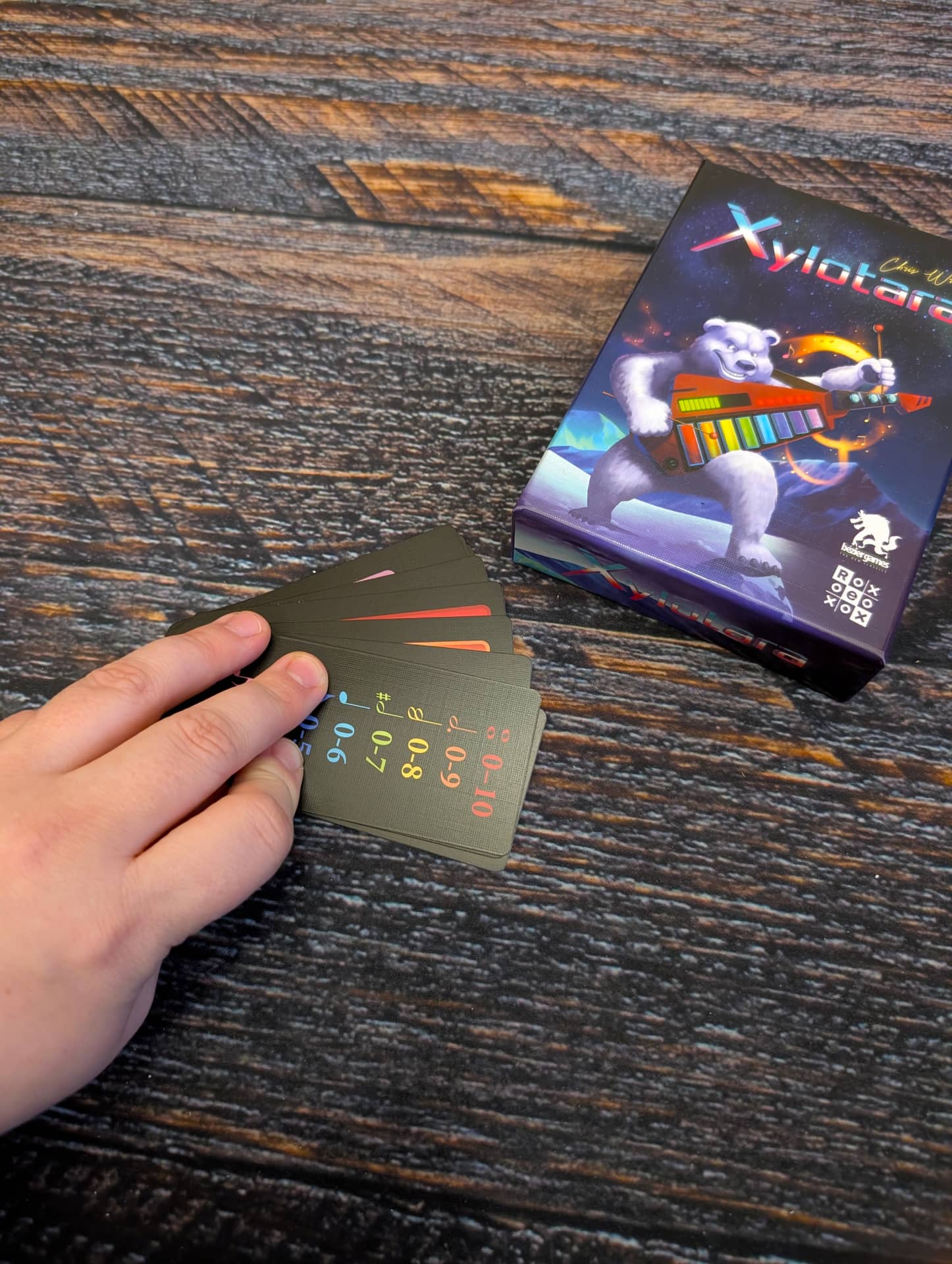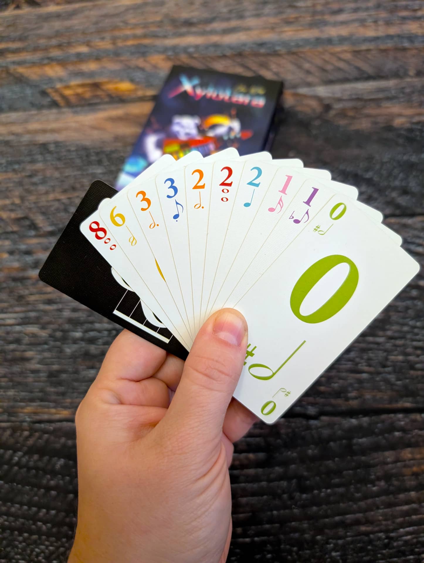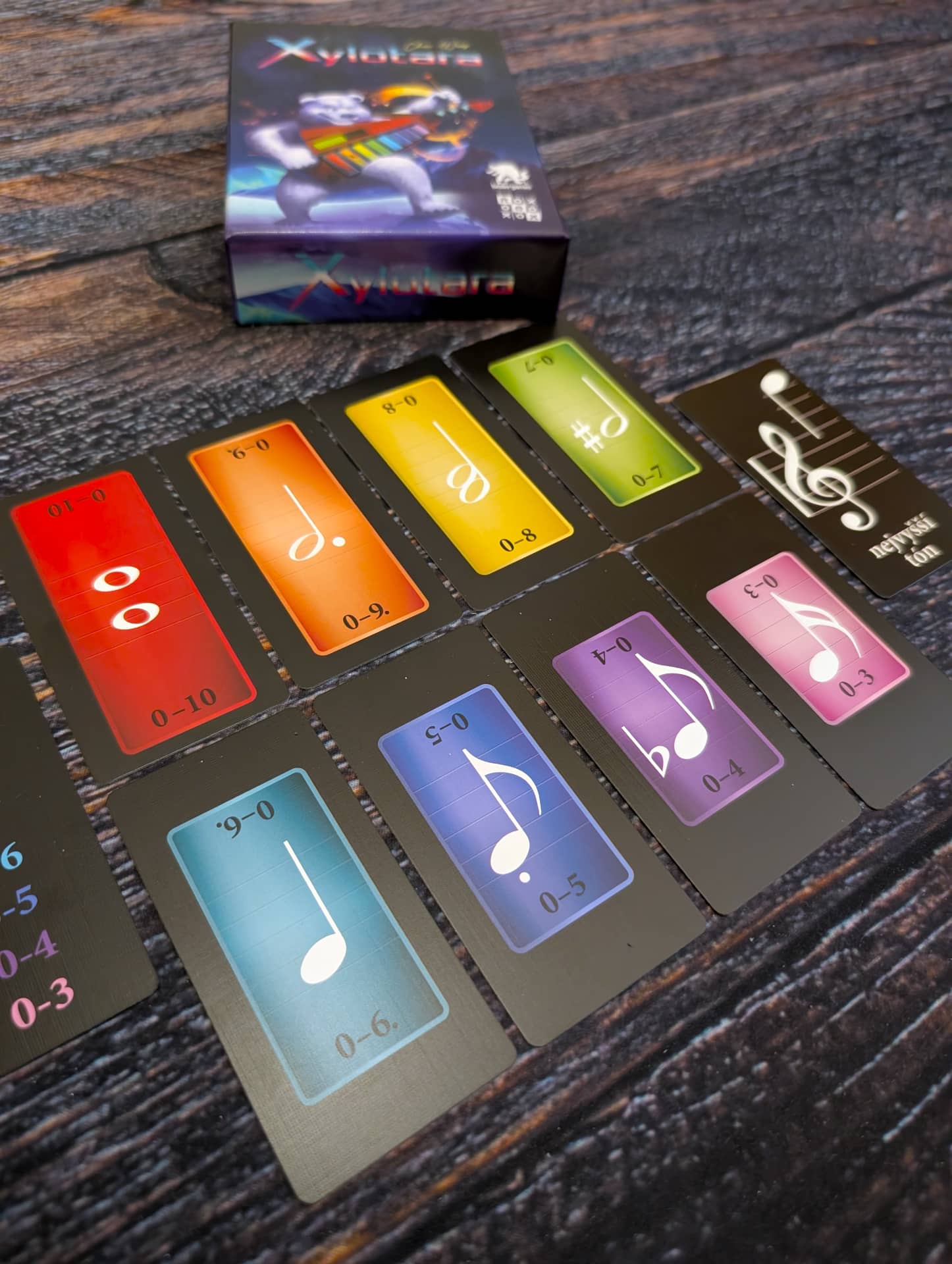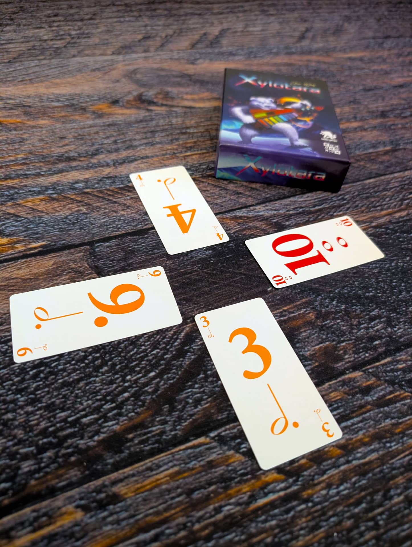 Prvním z nich je to, že karty nemáte v ruce, ale vyložené do řady před sebou od nejvyšší po nejnižší. Na rubu karet je vždy vidět barva, která odpovídá rozsahu možných hodnot. V balíčku se přitom nachází vždy jen jedna kopie každé možné kombinace barvy a hodnoty. Červené karty (tematicky odpovídající souzvukům celých not) mohou mít hodnoty 0–10, oranžové 3/4 noty 0–9, žluté souzvuky 1/2 not 0–8, zelené zvýšené 1/2 noty 0–7, modrozelené 1/4 noty 0–6, modré staccato 1/8 noty 0–5, fialové snížené 1/8 noty 0–4 a poslední růžové 1/16 noty 0–3.