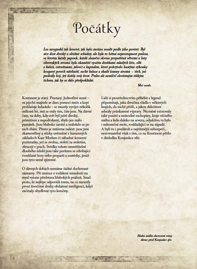 Skladbou knihy se totiž podíváme do celého kontinentu, včetně historie. Jak přišli elfové, co je Konjunkce sfér, příchod lidí, doba lidí, školení zaklínačů, a to je vše teprve začátek. Pak se totiž noříme hlouběji, a to do mého osobního zájmu, samotných království včetně zajímavých míst, jež mají v sáze místo nebo jen důležitou zmínku, aby se složila ta pořádná mozaika, co vlastně všechno onen Kontinent, především Severní království, skrývají, protože je toho vážně hodně.