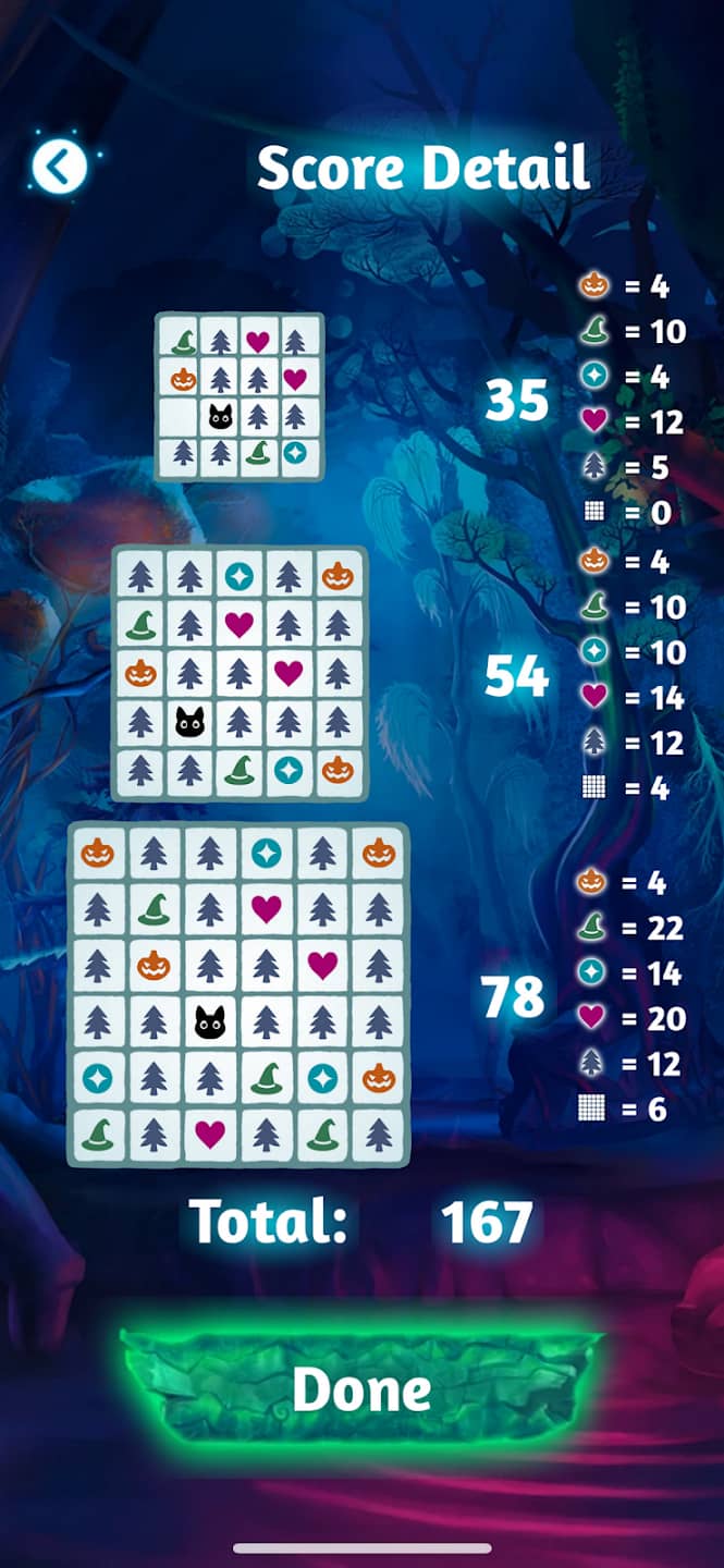 Její používání je velice jednoduché. Pro každý typ bludiček i stromy vyberete, kterou z variantních skórovacích karet v partii používáte a hra vás poté provede skórováním všech tří kol. Svoji mřížku plnou bludiček jednoduše vyfotíte, přičemž appka vám během focení ukazuje načtené prvky, a vy ji můžete kdykoliv vyresetovat, pokud by něco načetla špatně. Já osobně jsem se s tím zatím nesetkala, a to ani při hraní v horším osvětlení.