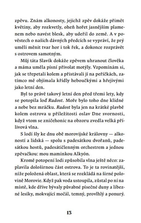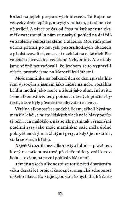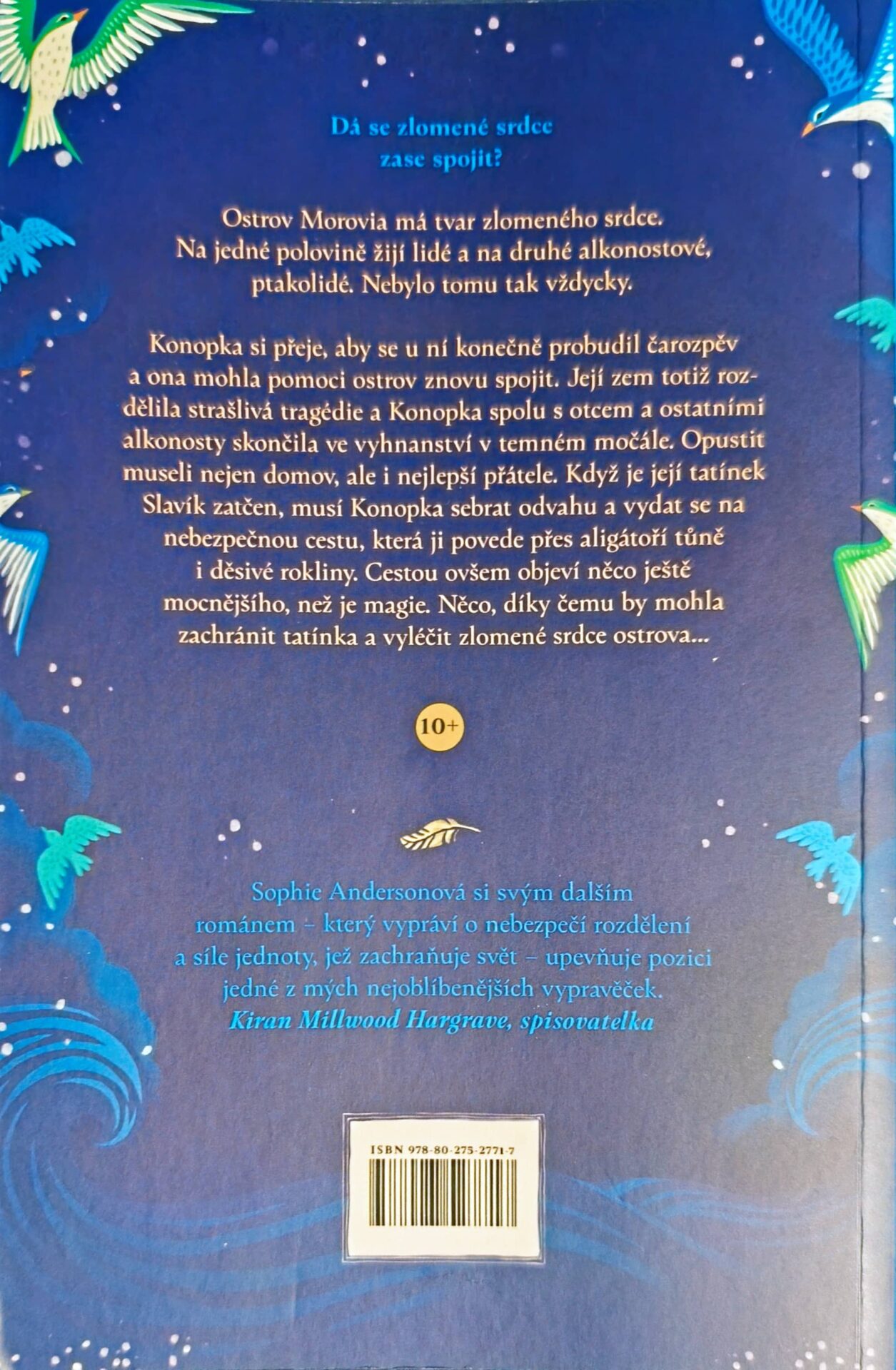 Hlavní hrdinkou je Konopka, dívka z alkonostského rodu, která touží po tom, aby se u ní konečně probudil dar čarozpěvu, magie spojené s hlasem a písní. Věří, že právě ona by mohla pomoci Morovii znovu se uzdravit. Spolu se svým otcem Slavíkem a ostatními alkonosty však žije ve vyhnanství, které je každodenní připomínkou ztráty.