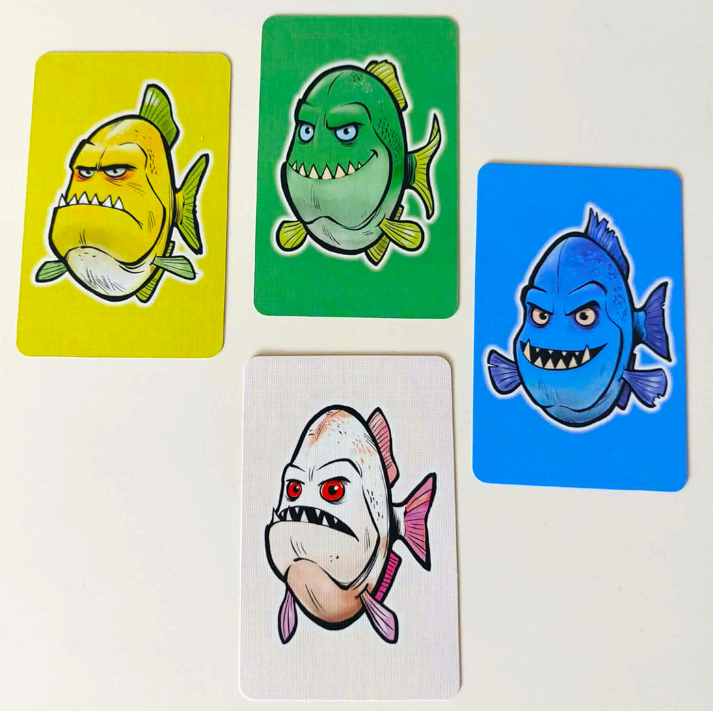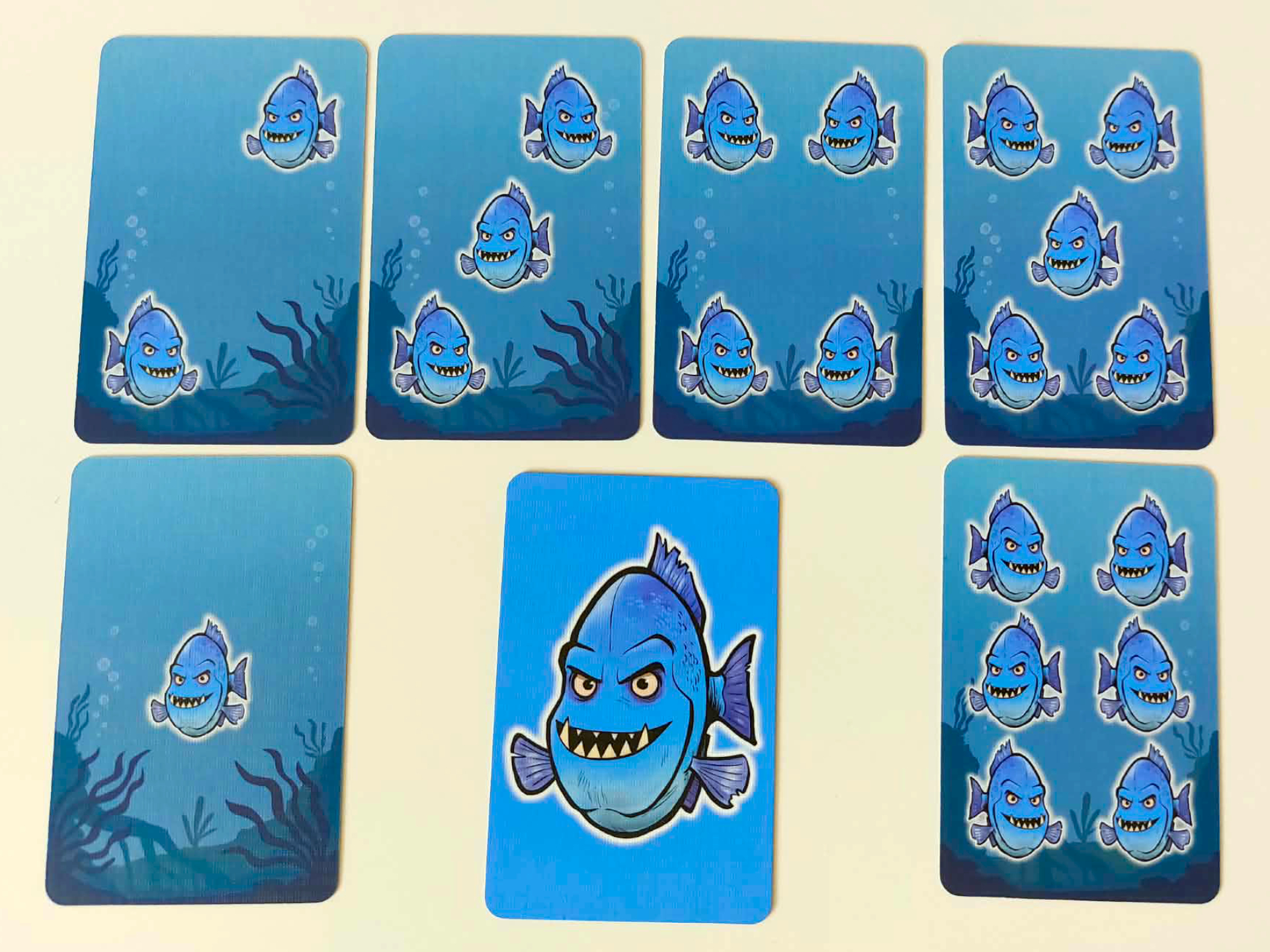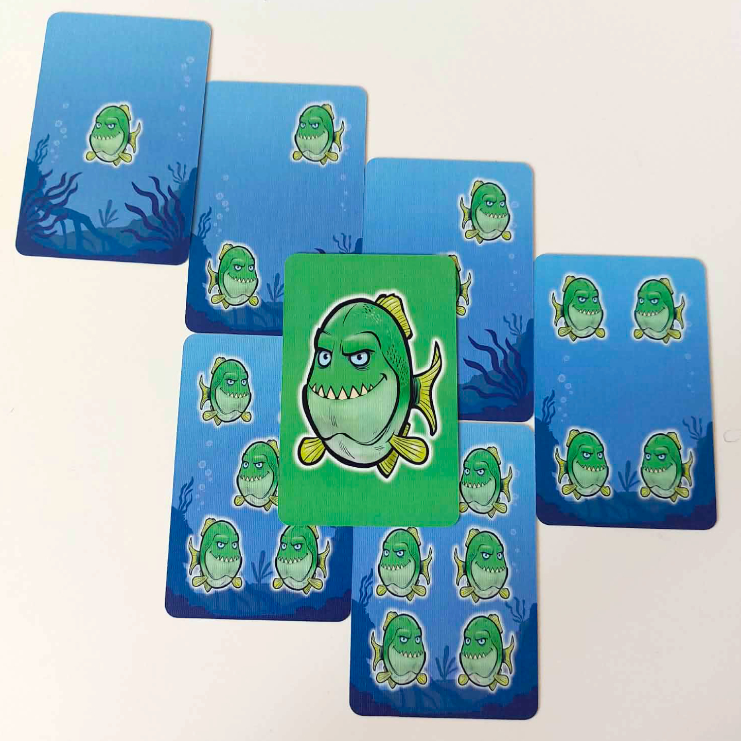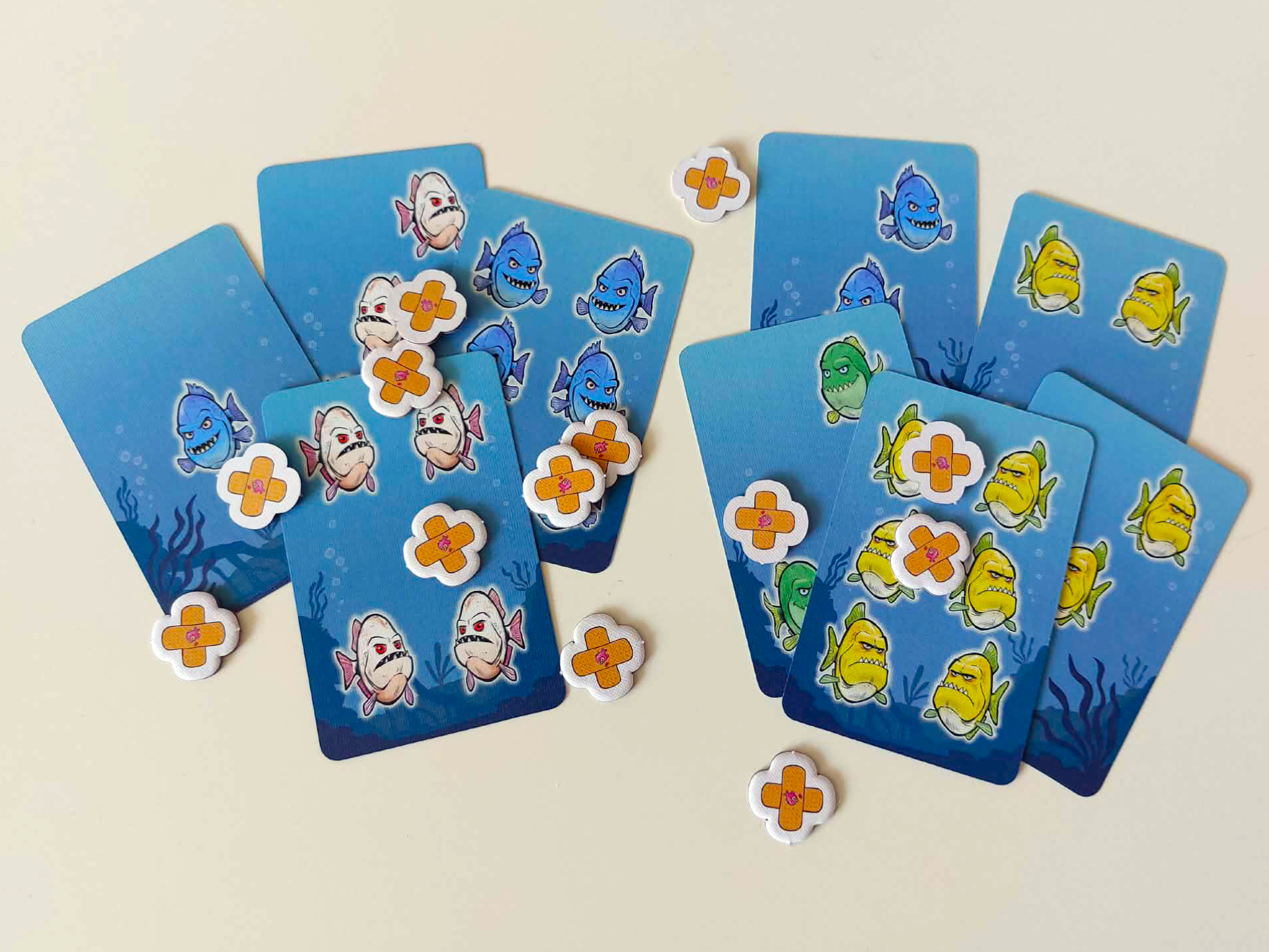 Základem celé hry je třicet šest pevných a kvalitně zpracovaných oboustranných karet, k nimž se navíc přidává pětadvacet kartonových žetonů náplastí a speciální čtveřice ochranných karet, kterou využijete výhradně pro kooperativní režim. Mechanicky nejzajímavějším prvkem je fakt, že rub a líc těchto herních karet představuje vždy zcela jinou barvu piraní, přičemž matematickým pravidlem zůstává, že při sečtení dravců na obou stranách dostanete u každé jednotlivé karty vždy přesně číslo sedm.